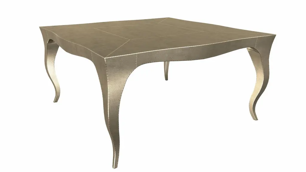 Nesting Tables from our Louise Collection. The renowned designer Paul Mathieu chose the name “Louise” when he created his more feminine version of Louis XV (1730-1760) furniture. The characteristic cabriole leg, curving outward at the knee and inward towards the foot in an "S" shape was born during this period. It is during the same era that English furniture makers produced the Queen Anne and Chippendale styles.Crafted with utmost care and attention to detail, these Louis Nesting Tables are made to order and are available in twelve metal clad finishes, ensuring that you can choose the perfect one to match your individual style and taste. The use of high-quality materials and expert craftsmanship ensure that each Art Deco Louis Nesting Tables is not only beautiful but also a true piece of art.The curved legs and side arms of this Art Deco Louis Nesting Tables are hand carved from solid pieces of teak. Pattern makers trace and cut complex forms that will cover the chair in a skin of copper, white bronze, brass or antiqued white bronze The metal finishes will tarnish over time. Regular non-abrasive household metal polishes can be used to restore the original luster.Overall, if you're looking for a piece of furniture that combines luxury, comfort, and style, then the Art Deco Nesting Tables is an excellent choice. With its distinctive curved profile and multiple finish options, this Chair set is sure to elevate the look of any room it is placed in, and be a beloved addition to your home for years to come.The images shown in this listing are shot in different lighting conditions and/or are 3D illustrations. We encourage our customers to please request a sample or a full sample set of 12 finishes so that they can experience the finish first hand. Louise Art Deco Carts and Bar Carts Mid. Hammered Brass 18.5x18.5x10 inch by Paul Mathieu for Stephanie OdegardSize- 18.5"x 18.5"x 10"HMaterials - Brass, Metal sheet, Teak, Wood, MetalTechniques: Hand-Crafted, Hand-Carved, Metal Work, Wood Work, Metal Wrapping, PolishedPlease note that moisture in air, sudden change in temperature and natural movement of wood over time causes the metal to wrinkle or bubble up. We use well seasoned, reclaimed teak and high quality marine grade MDF (wherever technically possible) to avoid and delay the mentioned changes. However a perfect stability of metal cannot be guaranteed. Please note that our smooth finish metal clad pieces will have some unavoidable tool marks. This is proof that everything is done by hand. The smooth finish will not come out like a machine made perfect surface and the master artisan will do their best to make it look as good/clean/stable/perfect as he possibly can.The antique white bronze finish is hand done by using an acidic chemical over the white bronze finish to recreate a natural patination. Like with the natural patination of silver, copper, or brass, the final result and color uniformity of the patina cannot be guaranteed. The goal of this finish is to achieve rainbow-like shades with dull, shiny, cloudy, and streaky patches to give an illusion of antiquing. Please note:None of our metal clad pieces are treated with a protective “finish” thus enabling the items to age naturally over time. We will of course polish them well before we pack them. a) Copper oxidizes faster than the other metals. In six to twelve months it will most likely lose its shine and will gradually turn to different shades of brown and/or green/blue. This aging process and its effect is referred to as verdigris. After a year the piece should not change much more. Copper does not rust, but does require periodic cleaning in order to retain its original shine if that the preferred option. ('BRASSO' or any known copper polish can be used to polish copper).b) Brass retains its shine for far longer than others, but will tarnish if not cleaned on occasion. ('BRASSO' is made to polish brass).c) White bronze, has the least tendency to show age or tarnish. If kept in a controlled climate, this metal will hold its shine for years. It can be cleaned with a cleanser and polished with a cloth. d) The antiqued white bronze finish will react with the natural elements the fastest in the beginning but it too will stop reacting and will settle down in a stable state like copper after 6-12 months. Since it is already antiqued and looked like it is tarnished, as described in an earlier message, this fast reaction will not change the over all look. In that way this surface is most forgiving. The images shown in this listing are shot in different lighting conditions and/or are 3D illustrations. We encourage our customers to please request a sample or a full sample set of 12 finishes so that they can experience the finish first hand.