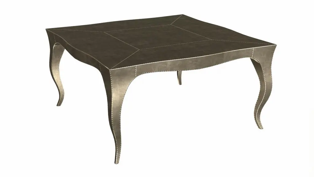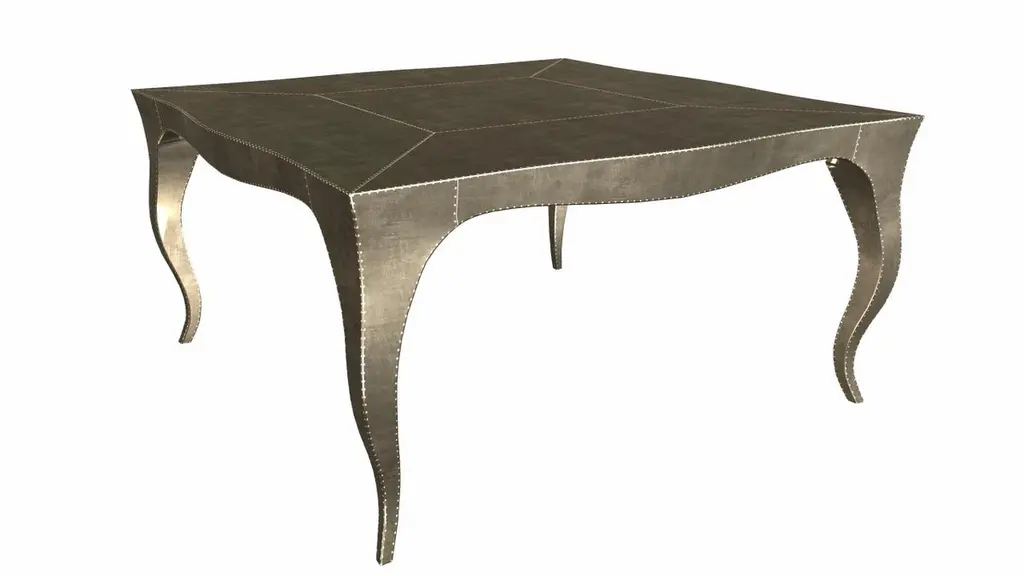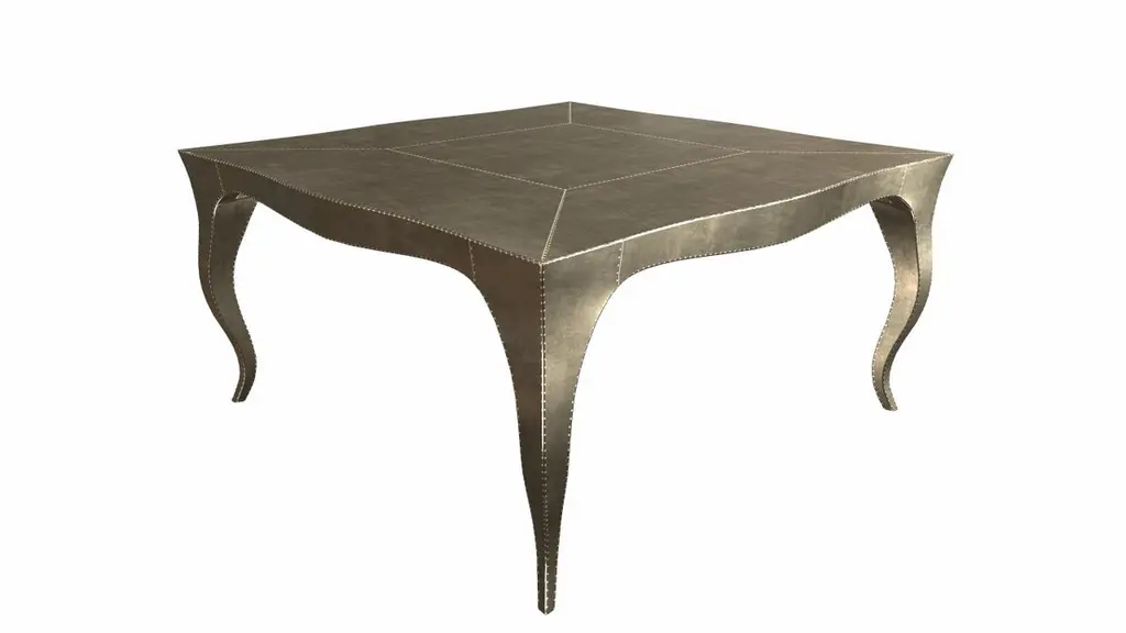 Nesting Tables from our Louise Collection. The renowned designer Paul Mathieu chose the name “Louise” when he created his more feminine version of Louis XV (1730-1760) furniture. The characteristic cabriole leg, curving outward at the knee and inward towards the foot in an "S" shape was born during this period. It is during the same era that English furniture makers produced the Queen Anne and Chippendale styles.Crafted with utmost care and attention to detail, these Louis Nesting Tables are made to order and are available in twelve metal clad finishes, ensuring that you can choose the perfect one to match your individual style and taste. The use of high-quality materials and expert craftsmanship ensure that each Art Deco Louis Nesting Tables is not only beautiful but also a true piece of art.The curved legs and side arms of this Art Deco Louis Nesting Tables are hand carved from solid pieces of teak. Pattern makers trace and cut complex forms that will cover the chair in a skin of copper, white bronze, brass or antiqued white bronze The metal finishes will tarnish over time. Regular non-abrasive household metal polishes can be used to restore the original luster.Overall, if you're looking for a piece of furniture that combines luxury, comfort, and style, then the Art Deco Nesting Tables is an excellent choice. With its distinctive curved profile and multiple finish options, this Chair set is sure to elevate the look of any room it is placed in, and be a beloved addition to your home for years to come.The images shown in this listing are shot in different lighting conditions and/or are 3D illustrations. We encourage our customers to please request a sample or a full sample set of 12 finishes so that they can experience the finish first hand. Louise Art Deco Carts and Bar Carts Smooth Brass 18.5x18.5x10 inch by Paul Mathieu for Stephanie OdegardSize- 18.5"x 18.5"x 10"HMaterials - Brass, Metal sheet, Teak, Wood, MetalTechniques: Hand-Crafted, Hand-Carved, Metal Work, Wood Work, Metal Wrapping, PolishedPlease note that moisture in air, sudden change in temperature and natural movement of wood over time causes the metal to wrinkle or bubble up. We use well seasoned, reclaimed teak and high quality marine grade MDF (wherever technically possible) to avoid and delay the mentioned changes. However a perfect stability of metal cannot be guaranteed. Please note that our smooth finish metal clad pieces will have some unavoidable tool marks. This is proof that everything is done by hand. The smooth finish will not come out like a machine made perfect surface and the master artisan will do their best to make it look as good/clean/stable/perfect as he possibly can.The antique white bronze finish is hand done by using an acidic chemical over the white bronze finish to recreate a natural patination. Like with the natural patination of silver, copper, or brass, the final result and color uniformity of the patina cannot be guaranteed. The goal of this finish is to achieve rainbow-like shades with dull, shiny, cloudy, and streaky patches to give an illusion of antiquing. Please note:None of our metal clad pieces are treated with a protective “finish” thus enabling the items to age naturally over time. We will of course polish them well before we pack them. a) Copper oxidizes faster than the other metals. In six to twelve months it will most likely lose its shine and will gradually turn to different shades of brown and/or green/blue. This aging process and its effect is referred to as verdigris. After a year the piece should not change much more. Copper does not rust, but does require periodic cleaning in order to retain its original shine if that the preferred option. ('BRASSO' or any known copper polish can be used to polish copper).b) Brass retains its shine for far longer than others, but will tarnish if not cleaned on occasion. ('BRASSO' is made to polish brass).c) White bronze, has the least tendency to show age or tarnish. If kept in a controlled climate, this metal will hold its shine for years. It can be cleaned with a cleanser and polished with a cloth. d) The antiqued white bronze finish will react with the natural elements the fastest in the beginning but it too will stop reacting and will settle down in a stable state like copper after 6-12 months. Since it is already antiqued and looked like it is tarnished, as described in an earlier message, this fast reaction will not change the over all look. In that way this surface is most forgiving. The images shown in this listing are shot in different lighting conditions and/or are 3D illustrations. We encourage our customers to please request a sample or a full sample set of 12 finishes so that they can experience the finish first hand.