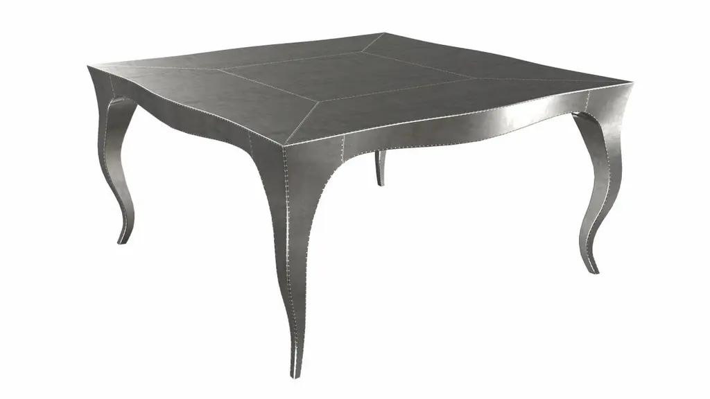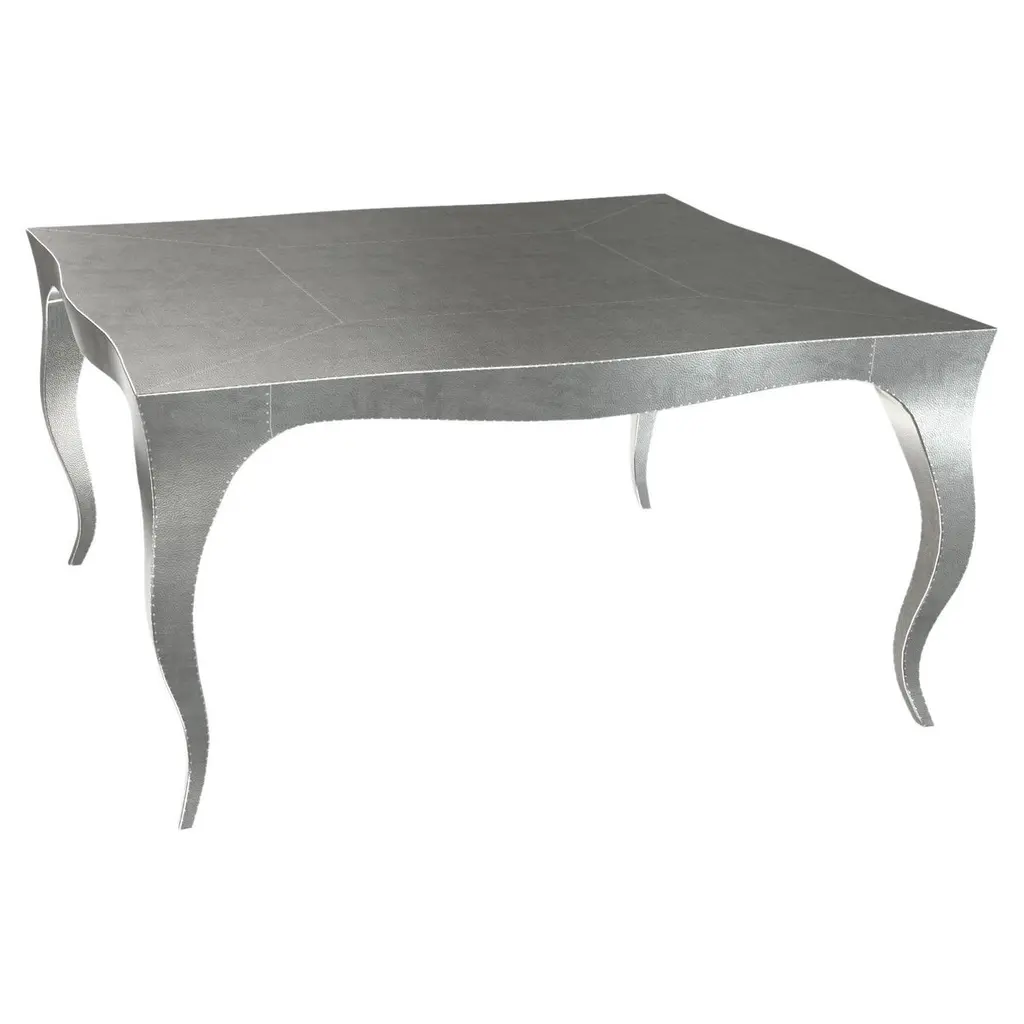 Nesting Tables from our Louise Collection. The renowned designer Paul Mathieu chose the name “Louise” when he created his more feminine version of Louis XV (1730-1760) furniture. The characteristic cabriole leg, curving outward at the knee and inward towards the foot in an "S" shape was born during this period. It is during the same era that English furniture makers produced the Queen Anne and Chippendale styles.Crafted with utmost care and attention to detail, these Louis Nesting Tables are made to order and are available in twelve metal clad finishes, ensuring that you can choose the perfect one to match your individual style and taste. The use of high-quality materials and expert craftsmanship ensure that each Art Deco Louis Nesting Tables is not only beautiful but also a true piece of art.The curved legs and side arms of this Art Deco Louis Nesting Tables are hand carved from solid pieces of teak. Pattern makers trace and cut complex forms that will cover the chair in a skin of copper, white bronze, brass or antiqued white bronze The metal finishes will tarnish over time. Regular non-abrasive household metal polishes can be used to restore the original luster.Overall, if you're looking for a piece of furniture that combines luxury, comfort, and style, then the Art Deco Nesting Tables is an excellent choice. With its distinctive curved profile and multiple finish options, this Chair set is sure to elevate the look of any room it is placed in, and be a beloved addition to your home for years to come.The images shown in this listing are shot in different lighting conditions and/or are 3D illustrations. We encourage our customers to please request a sample or a full sample set of 12 finishes so that they can experience the finish first hand. Louise Art Deco Carts and Bar Carts Smooth White Bronze by Paul MathieuSize- 31.5"x 31.5"x 16"HMaterials - White Bronze, Metal sheet, Teak, Wood, MetalTechniques: Hand-Crafted, Hand-Carved, Metal Work, Wood Work, Metal Wrapping, PolishedPlease note that moisture in air, sudden change in temperature and natural movement of wood over time causes the metal to wrinkle or bubble up. We use well seasoned, reclaimed teak and high quality marine grade MDF (wherever technically possible) to avoid and delay the mentioned changes. However a perfect stability of metal cannot be guaranteed. Please note that our smooth finish metal clad pieces will have some unavoidable tool marks. This is proof that everything is done by hand. The smooth finish will not come out like a machine made perfect surface and the master artisan will do their best to make it look as good/clean/stable/perfect as he possibly can.The antique white bronze finish is hand done by using an acidic chemical over the white bronze finish to recreate a natural patination. Like with the natural patination of silver, copper, or brass, the final result and color uniformity of the patina cannot be guaranteed. The goal of this finish is to achieve rainbow-like shades with dull, shiny, cloudy, and streaky patches to give an illusion of antiquing. Please note:None of our metal clad pieces are treated with a protective “finish” thus enabling the items to age naturally over time. We will of course polish them well before we pack them. a) Copper oxidizes faster than the other metals. In six to twelve months it will most likely lose its shine and will gradually turn to different shades of brown and/or green/blue. This aging process and its effect is referred to as verdigris. After a year the piece should not change much more. Copper does not rust, but does require periodic cleaning in order to retain its original shine if that the preferred option. ('BRASSO' or any known copper polish can be used to polish copper).b) Brass retains its shine for far longer than others, but will tarnish if not cleaned on occasion. ('BRASSO' is made to polish brass).c) White bronze, has the least tendency to show age or tarnish. If kept in a controlled climate, this metal will hold its shine for years. It can be cleaned with a cleanser and polished with a cloth. d) The antiqued white bronze finish will react with the natural elements the fastest in the beginning but it too will stop reacting and will settle down in a stable state like copper after 6-12 months. Since it is already antiqued and looked like it is tarnished, as described in an earlier message, this fast reaction will not change the over all look. In that way this surface is most forgiving. The images shown in this listing are shot in different lighting conditions and/or are 3D illustrations. We encourage our customers to please request a sample or a full sample set of 12 finishes so that they can experience the finish first hand.