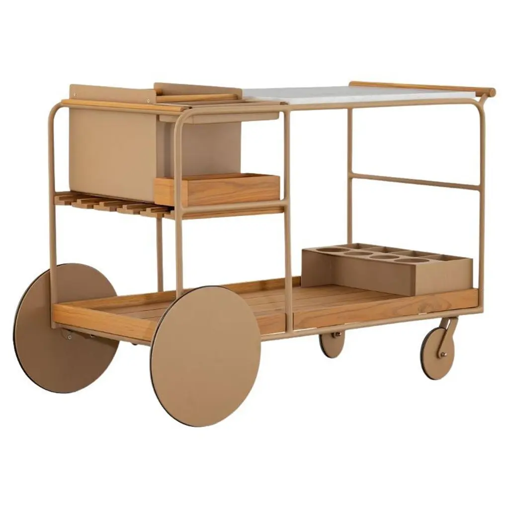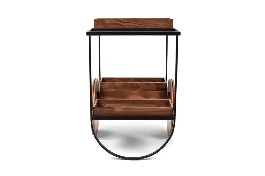Magenta is a serving trolley. A piece from real, unmistakable Italian design. A synthesis between aesthetics and practicality. Harmonious lines that join the strong burnished metal profile with walnut wood, leather floors and with three removable boxes. This trendy bar cart has two big wheels that beautifully finish the product allowing movement.