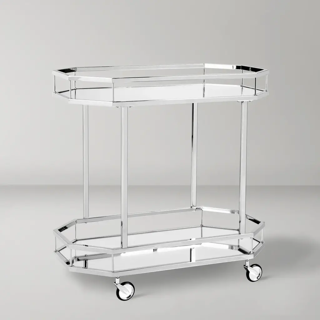 Our modestly-sized Metropolitan Bar Cart allows you to transport and arrange your libations when entertaining. Sleek and contemporary, it features a mirrored tray top and bottom set upon casters. This cart has been finished in chrome, providing a lustrous sheen. Stunning as a decorative piece and functional as a moving bar, you can socialize as you wheel your libations to the chosen destination in high style. Z Gallerie exclusive
