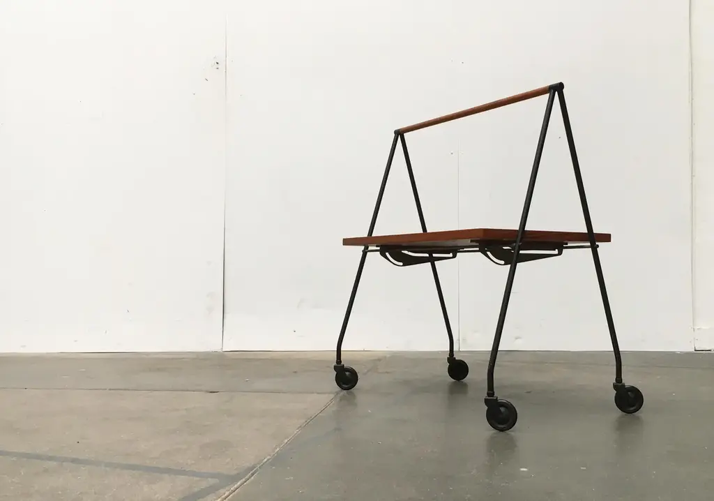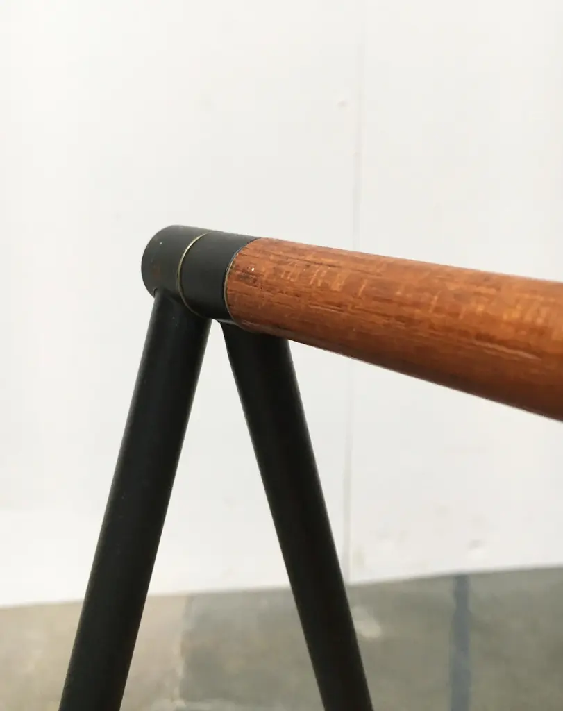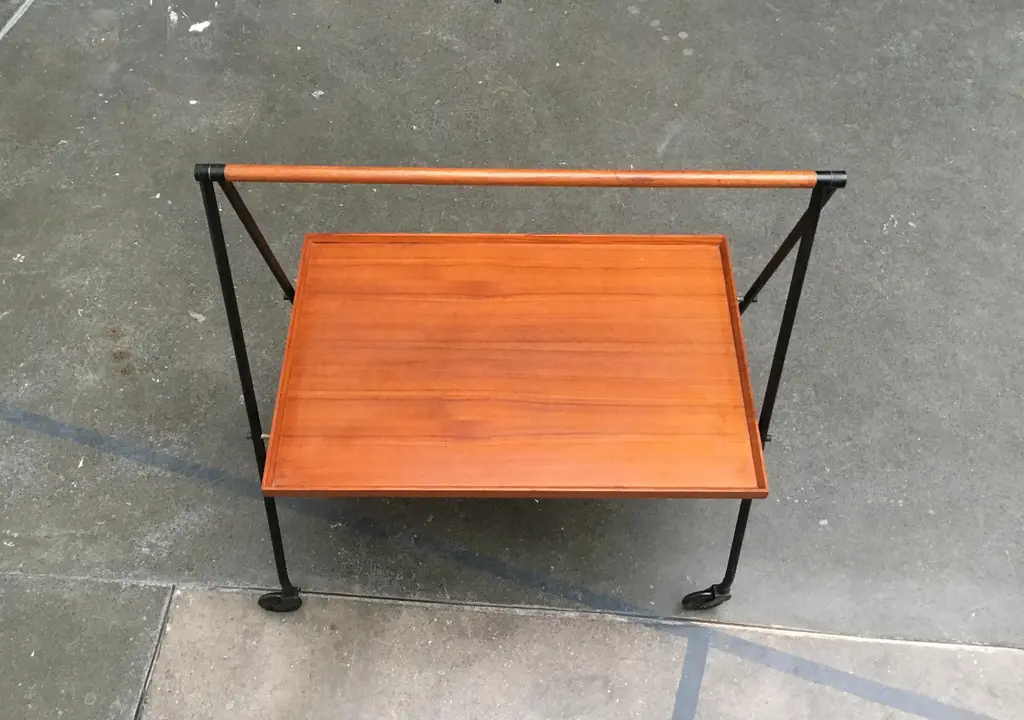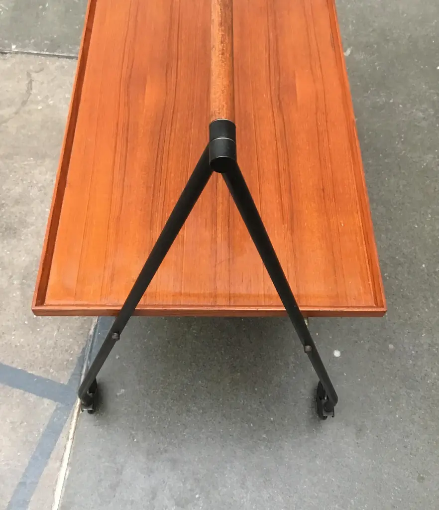 Elegant teak tea trolley with striking shape and finely executed details. Especially eye-catching is the elegant A-shape of the frame, which is completely in black. The teak elements, the shelf, and the handle form a wonderful contrast. The continuous teak handle merges on both sides directly into a finely formed joint, which has the same diameter as the teak rod. A sophisticated folding mechanism allows the trolley to be compressed to a minimum and allows for quick and easy stowage. The trolley is attributed online sometimes Denmark and sometimes Italy. From the language of form and materiality, both would be conceivable. It is in very good condition and has hardly any signs of use.