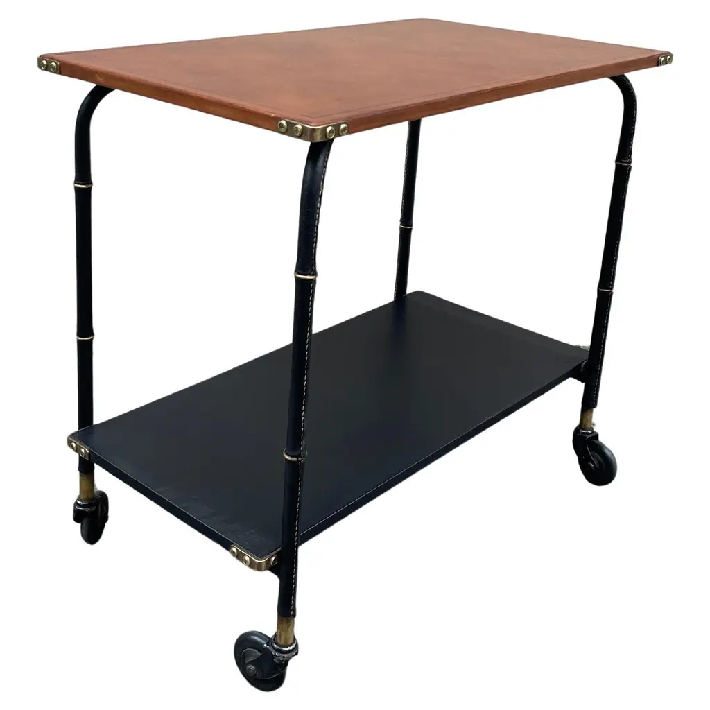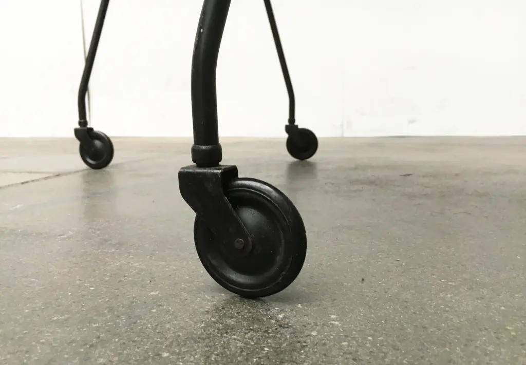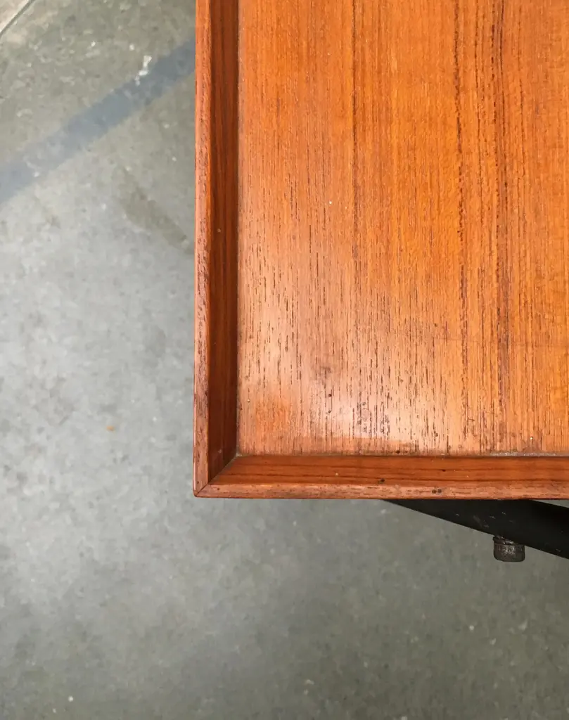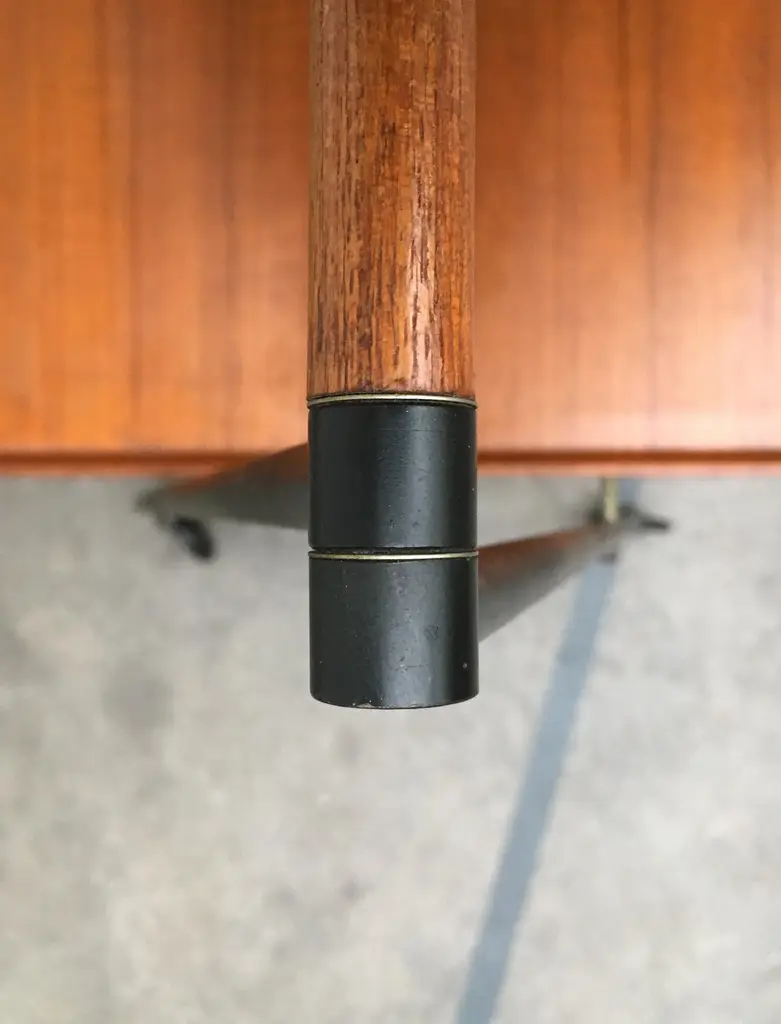 Elegant teak tea trolley with striking shape and finely executed details. Especially eye-catching is the elegant A-shape of the frame, which is completely in black. The teak elements, the shelf, and the handle form a wonderful contrast. The continuous teak handle merges on both sides directly into a finely formed joint, which has the same diameter as the teak rod. A sophisticated folding mechanism allows the trolley to be compressed to a minimum and allows for quick and easy stowage. The trolley is attributed online sometimes Denmark and sometimes Italy. From the language of form and materiality, both would be conceivable. It is in very good condition and has hardly any signs of use.
