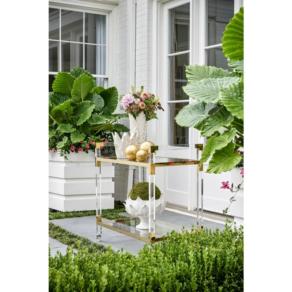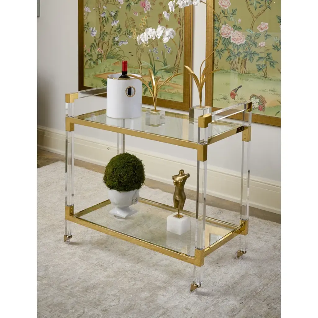 Clear acrylic with clear glass shelves and polished brass-finished iron edging.