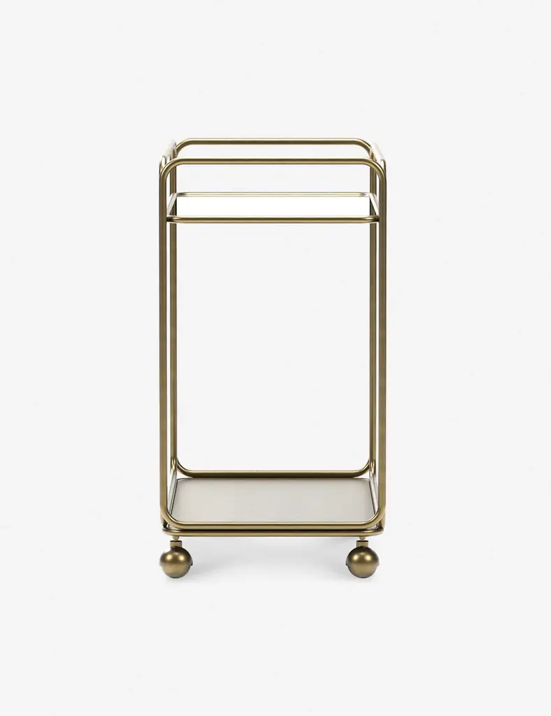 A bar cart made for bringing a refined style to your small space look. The steel tube frame sits on ball casters casting an airy, modern silhouette perfect for a curated design moment or dynamic appeal when entertaining.