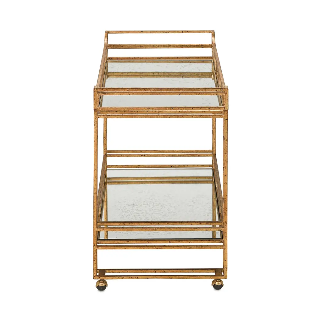 The Odeon Gold Bar Cart has an Asian style with its skillful wrought iron fretwork in a Seneca gold leaf finish. The light Roche antique mirror surfaces and caster feet make this gold bar cart popular during happy hour and for the beauty it brings to a space. The grid pattern formed by the lines of this piece bring it a mid-century modern flair. Ships In 7-10 Business Days This image is for illustrative purposes only. The colors shown are accurate within the constraints of lighting, photography, and the color accuracy of your screen.