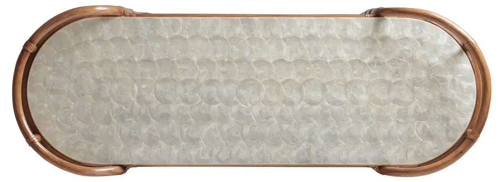 Practical and eye-catching, this bar cart is an ideal marriage of retro charm and contemporary glamour. Within the rattan frame, which is reinforced with leather straps, are three shelves: The top is crafted of lustrous capiz shells, the middle of tempered glass, and the bottom features sugarcane strips arranged in a diamond patttern. The golden galleries of the middle and bottom shelves help prevent items from falling while also adding timeless sophistication. Casters make the cart easy to move from room to room.
