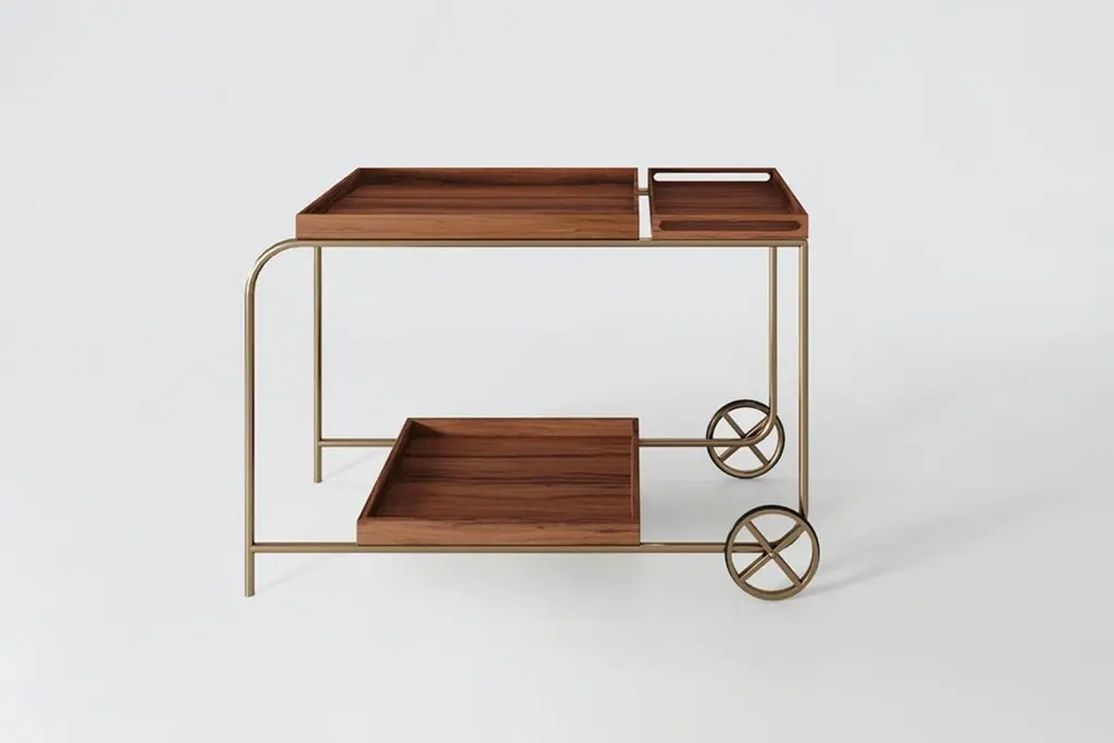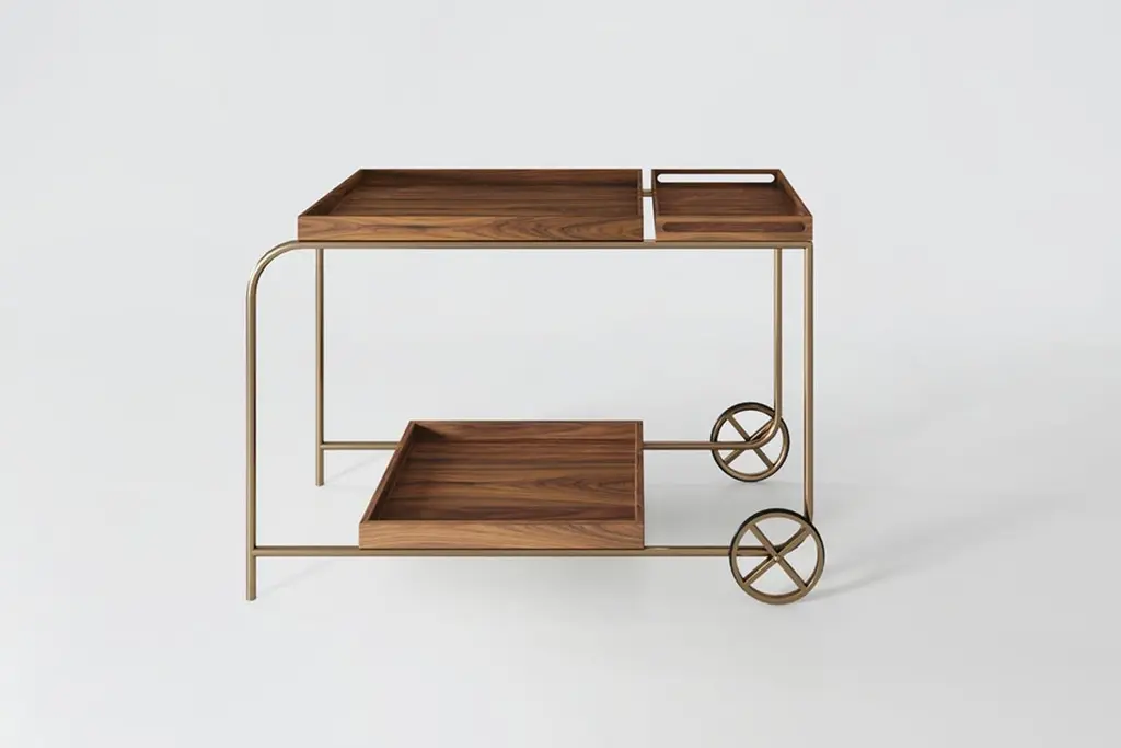 With the Pedro trolley, Alessandra pays a loving tribute to her father. The light and functional piece has an interesting detail: the smaller top tray is movable, allowing you to use it for serving.The structure of the sculptural piece is made of steel with anti-corrosion paint. To support the utensils, the Pedro trolley has trays made of laminated natural wood mdf. The smaller rear wheels of the Pedro trolley are fixed, while the front wheels remain movable to aid movement. The tray with the hand tray is not fixed, making serving practical.Important: this piece is made in steel for internal and dry areas.