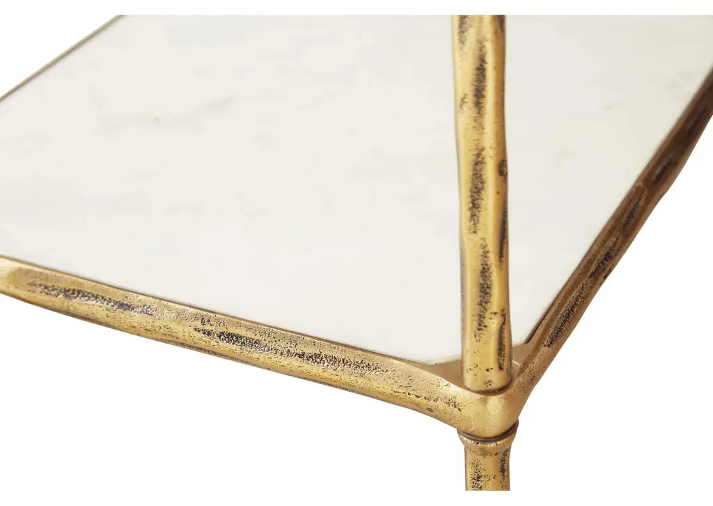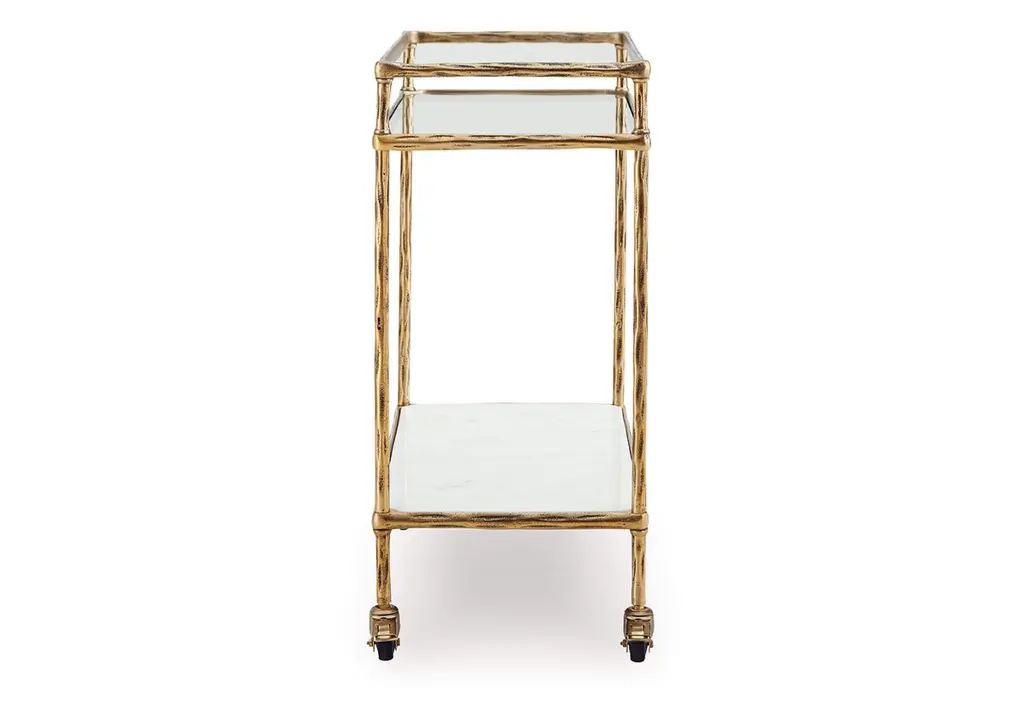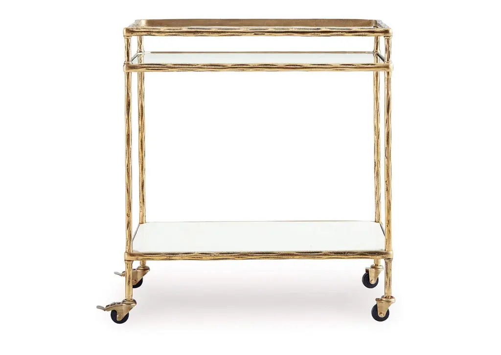 Store and serve in sleek style with the Plattfield bar cart. Its casually cool design combines an antiqued brass-tone frame with white marble and clear glass. Rails on the top shelf help bottles and shakers stay organized. And with its rolling casters, you can make your at-home mini bar mobile and bring the party where your guests gather. It can also act as a cute coffee station—perfect for storing syrups, mugs and other must-haves for your morning brew. Weight 49.000 lbs. (22.05kgs.)