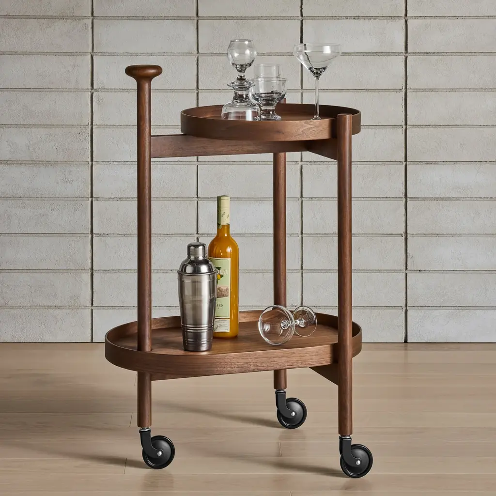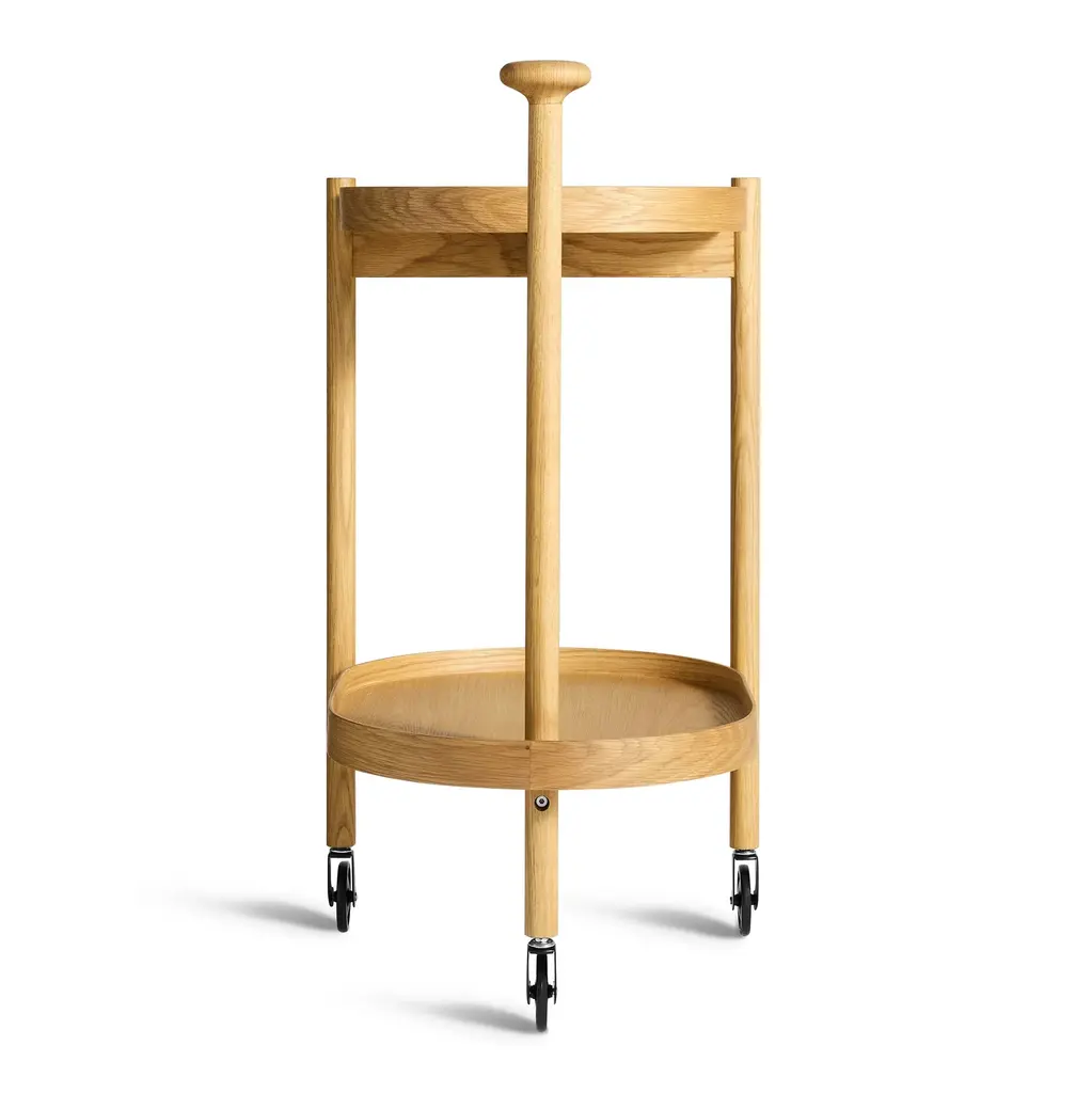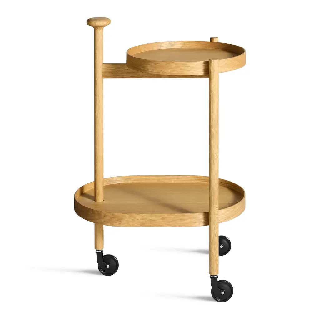 Fixed wood shelves, fine-tuned proportions and thoughtful details make this light and nimble cart the ideal co-host. Pleasantly rounded knob lets you steer one-handed while swivel casters let you spin it any which way to refresh drinks in a flash.