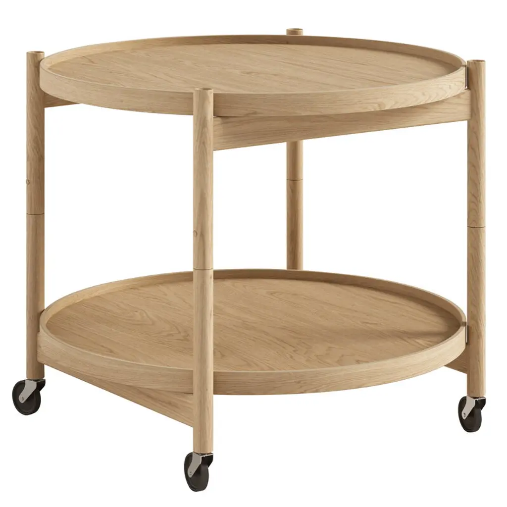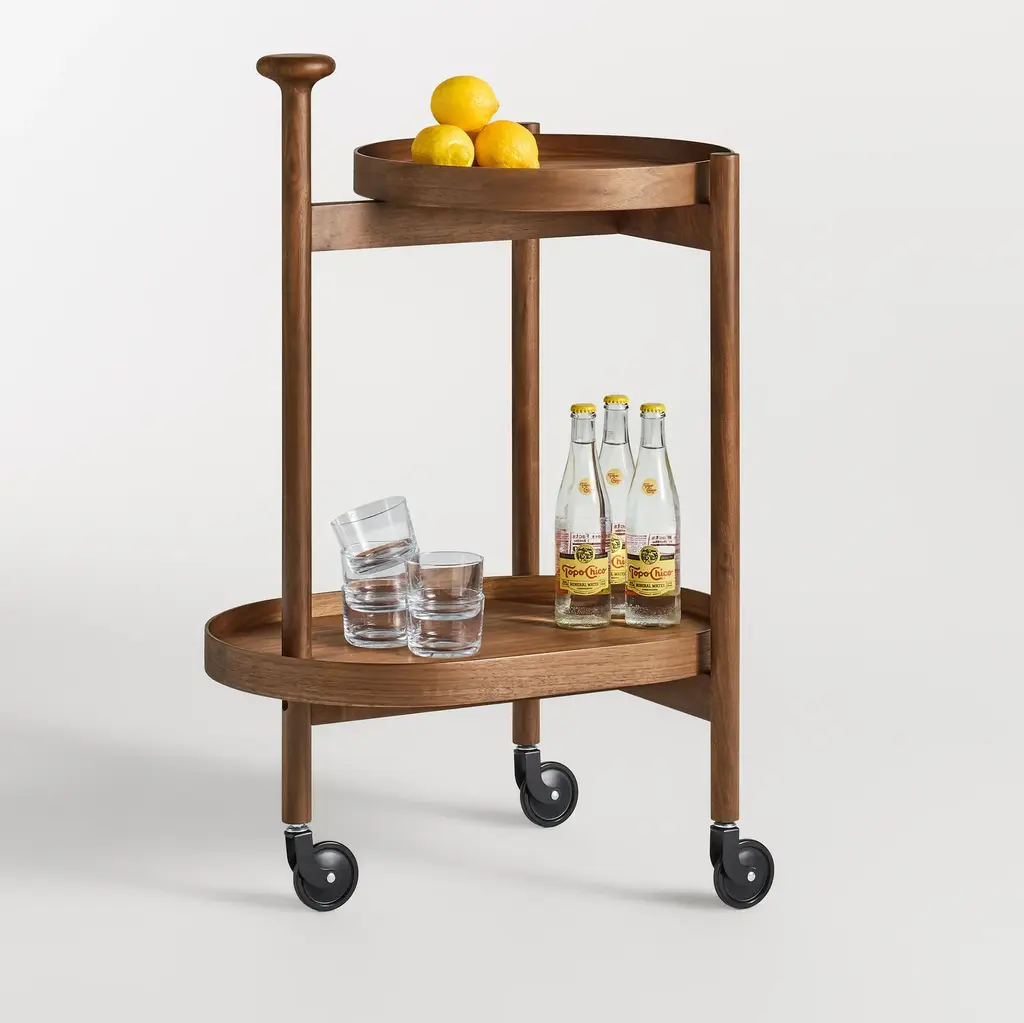 Fixed wood shelves, fine-tuned proportions and thoughtful details make this light and nimble cart the ideal co-host. Pleasantly rounded knob lets you steer one-handed while swivel casters let you spin it any which way to refresh drinks in a flash.