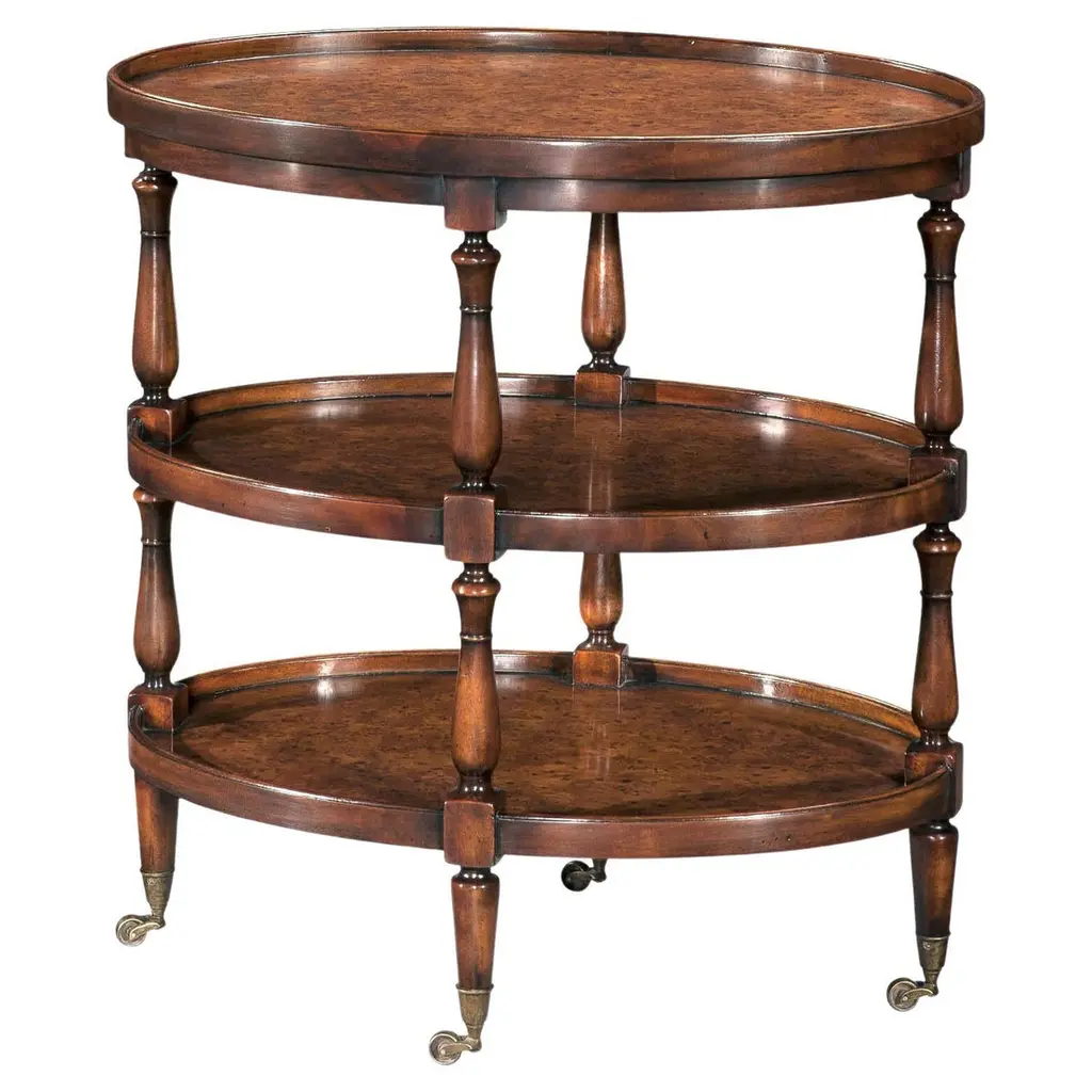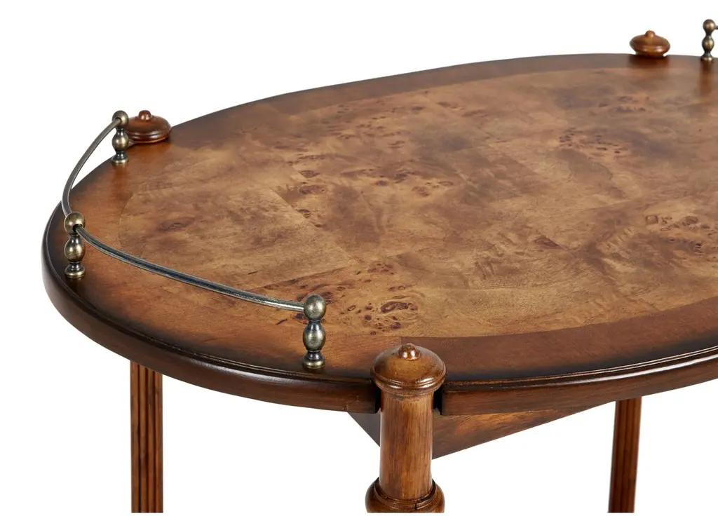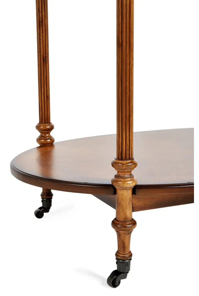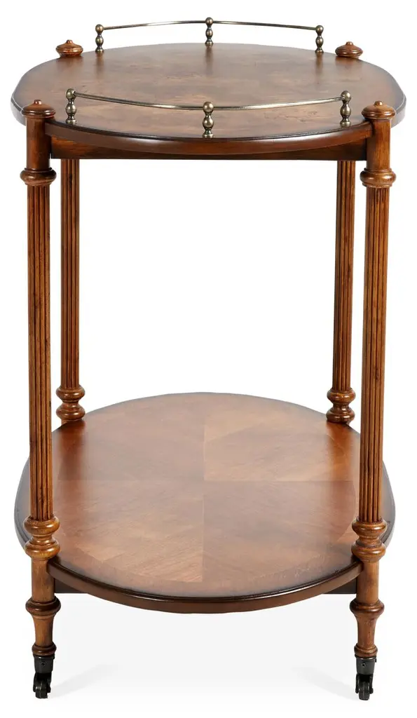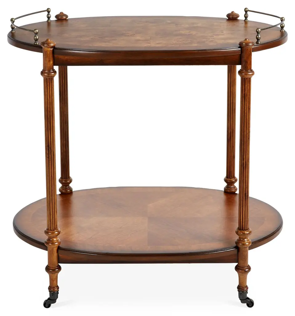 This charming cart can be used as both a bar cart or tea server and is a wonderful addition to any space for casual or formal entertaining. Handcrafted from select hardwood solids and wood products, it features an antique brass finished gallery and casters.