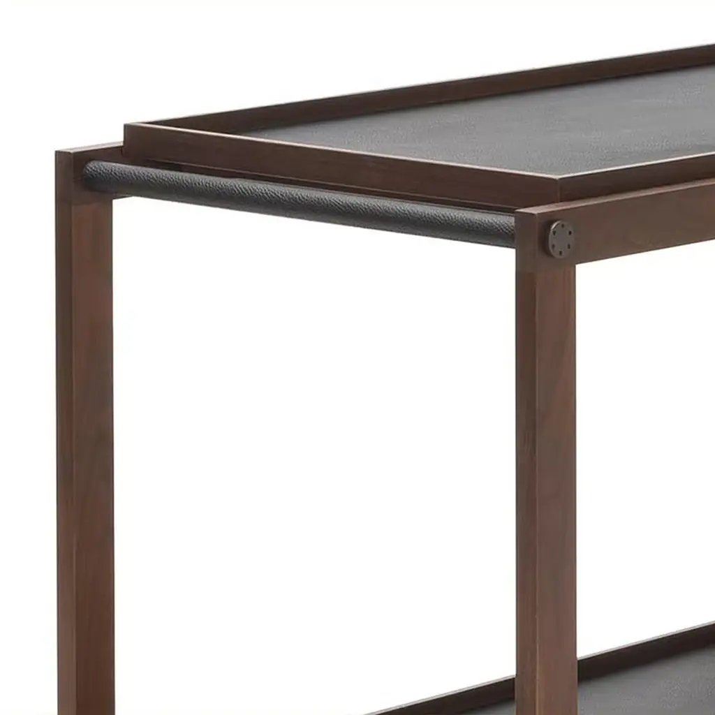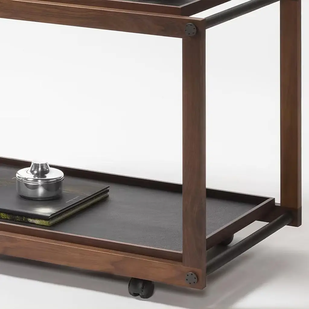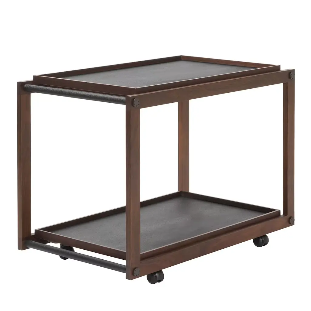 Trolley Reys with all structure in solid walnut wood structure and handles and trays tops covered with grained leather in black color. The 2 table trays are removables. Trolley on 4 rotatives castors.