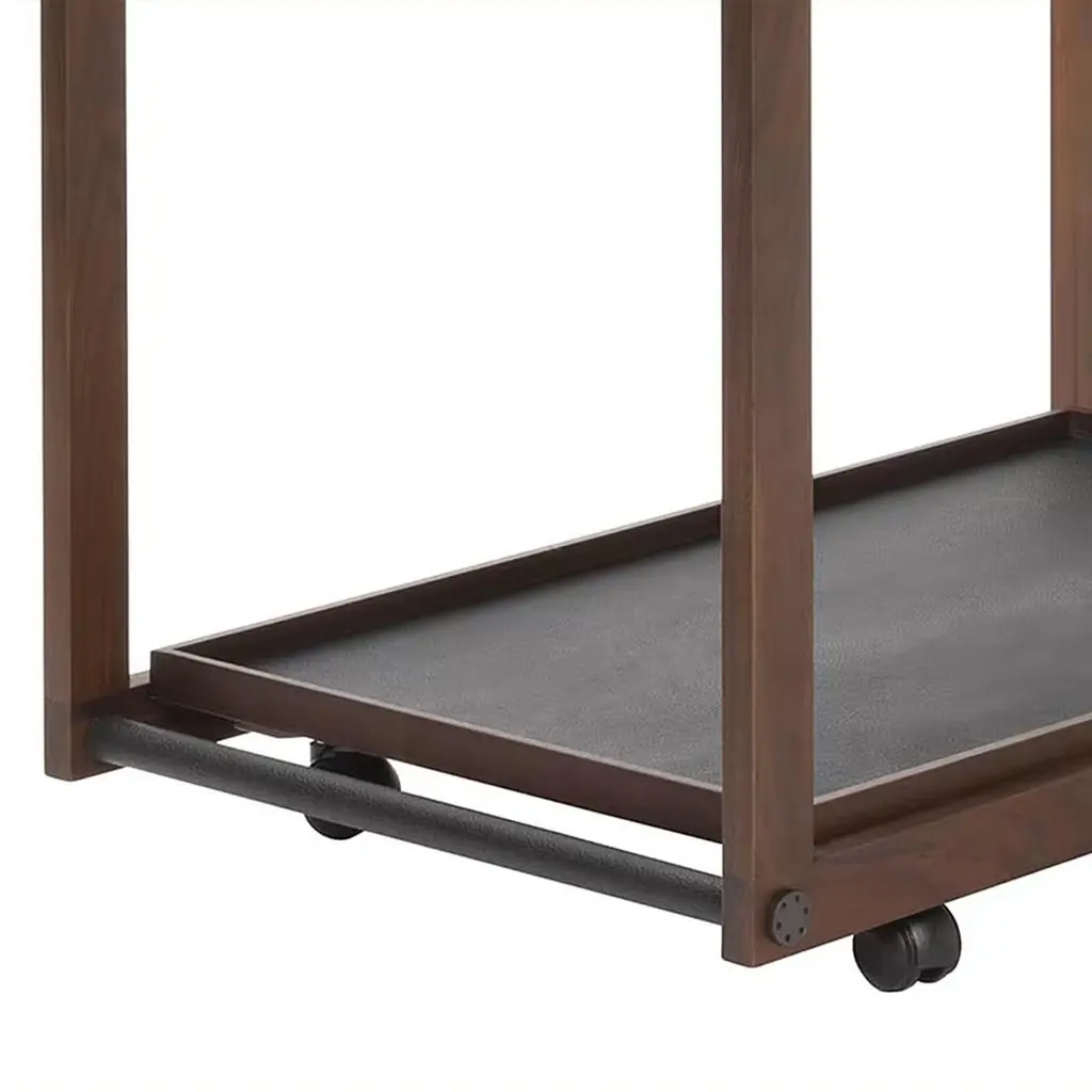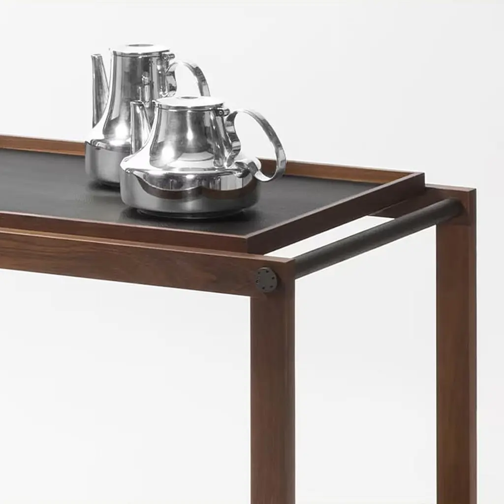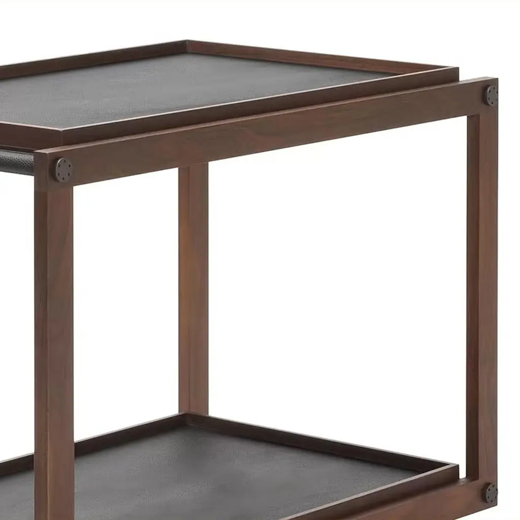 Trolley Reys with all structure in solid walnut wood structure and handles and trays tops covered with grained leather in black color. The 2 table trays are removables. Trolley on 4 rotatives castors.