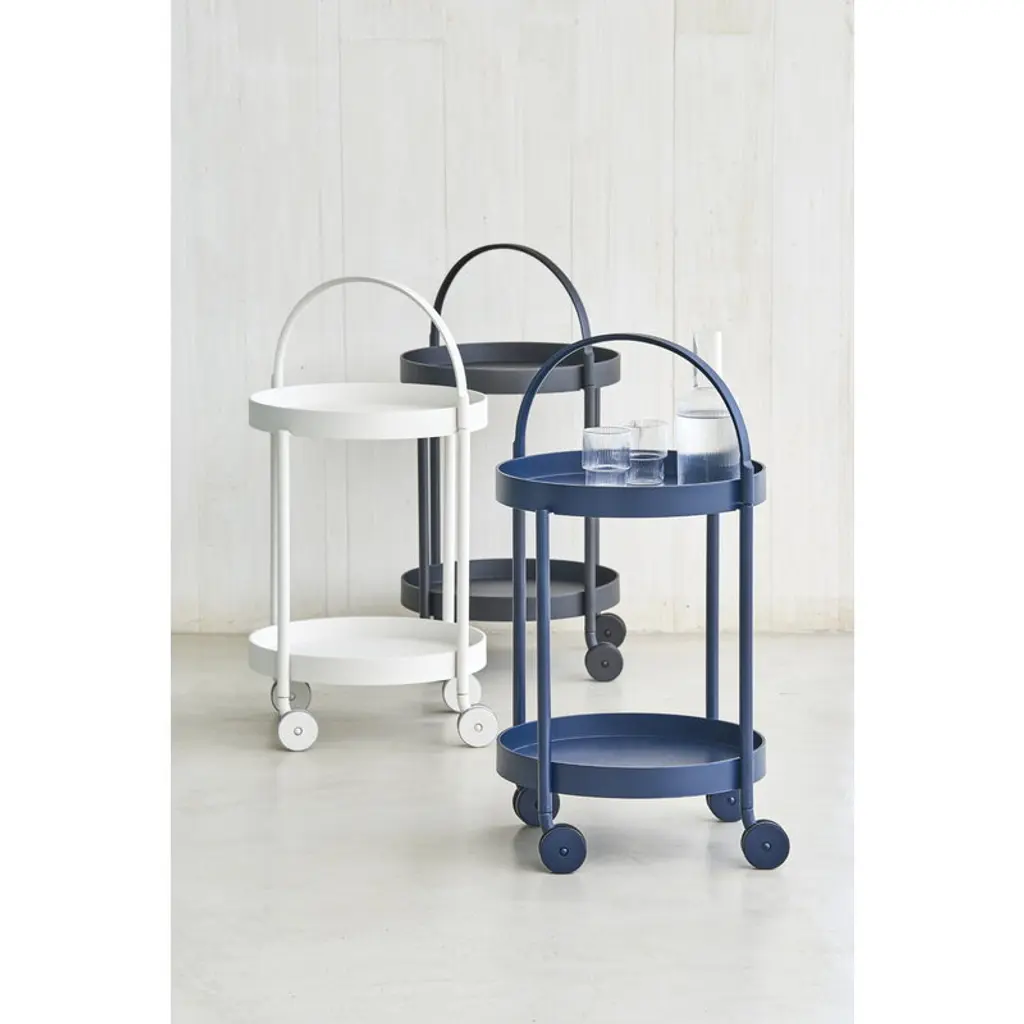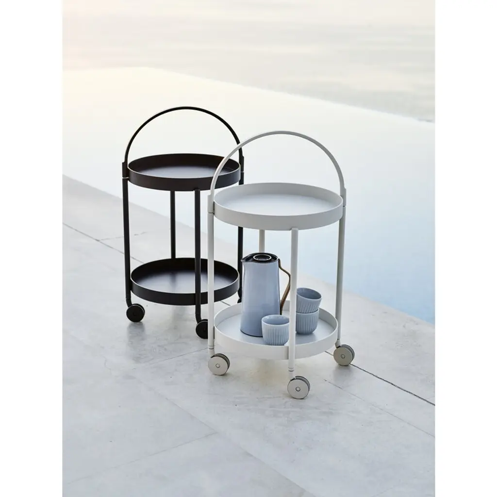 The Roll trolley, designed by Welling/Ludvik for Cane-line, is a modern and multifunctional piece of outdoor furniture that will easily blend into a variety of spaces for a variety of purposes. Due to its durable yet lightweight aluminum frame, Roll is a great option for the patio or garden, but can just as well be placed in the kitchen or living room. You can also use the Roll trolley as a small serving trolley.