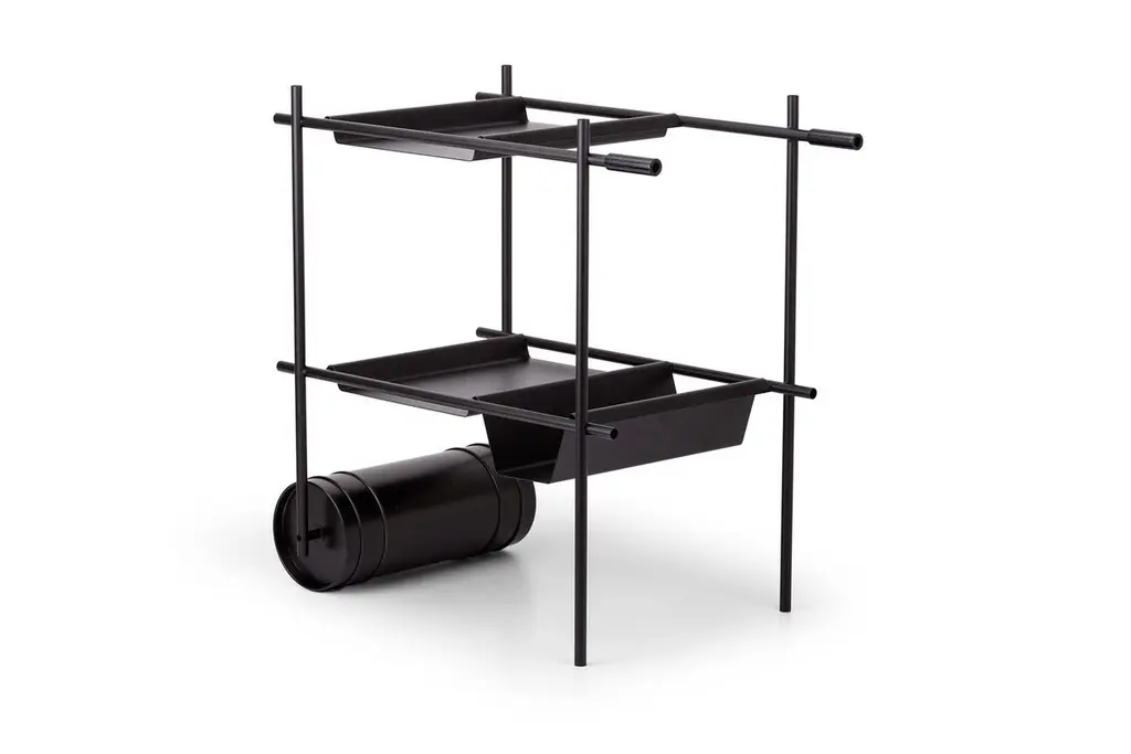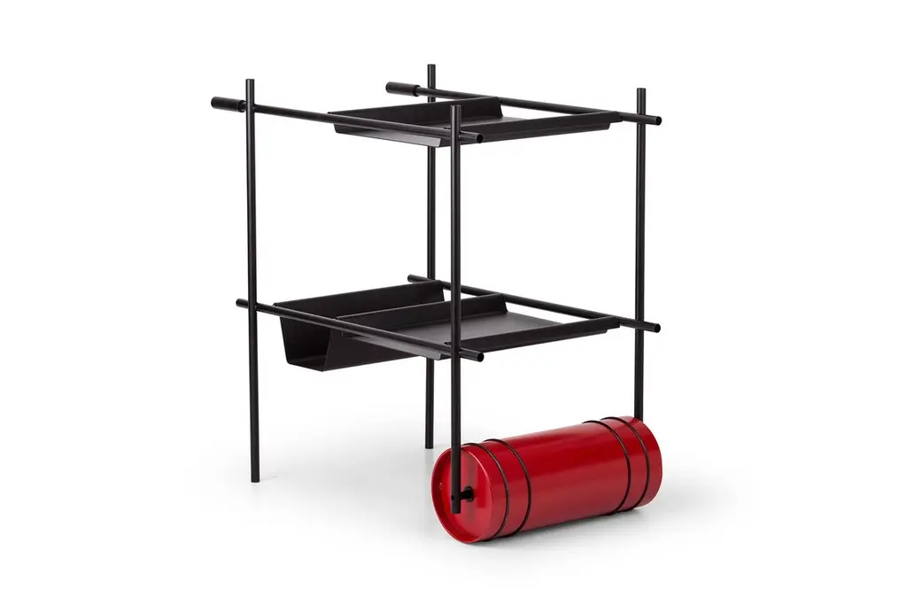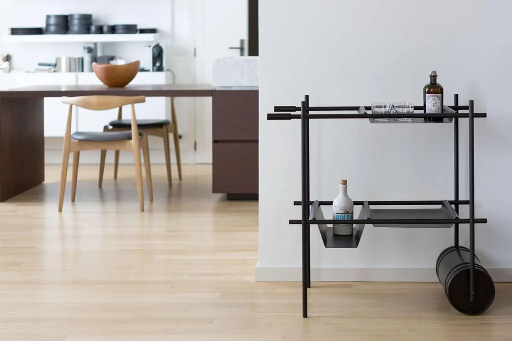 Rollingin Drink Trolley by MingardoDimensions: D86 x W54 x H82 cm Materials: Ral 9005 black varnished iron structure and black/ red varnishedaluminium wheelWeight: 20 kgAlso Available in different finishes. Rollingin is a cart for serving spirits. The project researches the best combination between simply primordially being and high quality handmade. The same way how I would describe the best gin tonic.Mingardo Ilario founded Mingardo Blacksmith Workshop in 1970, after over twenty years’ experience in the metal processing field.The production was initially focused on simple blacksmith works for the construction industry. Over the time, it has become more refined, enabling the company to collaborate with internationally renowned companies and architects: from the first collaborations with architect Carlo Scarpa to the more recent commissions for Museo del Novecento in Milan, Parco della Musica in Florence, and Teatro Petruzzelli in Bari.Over the years, the Workshop has achieved great results, with the production of unique metal products, all hand-wrought by a highly skilled team of specialized artisans. Nowadays, it is highly regarded in the local artisan field for its high-end refined finishing touches and details, and for its know-how.