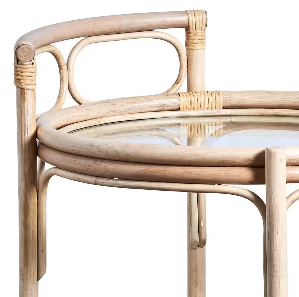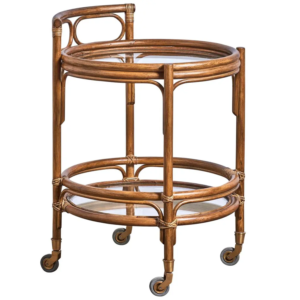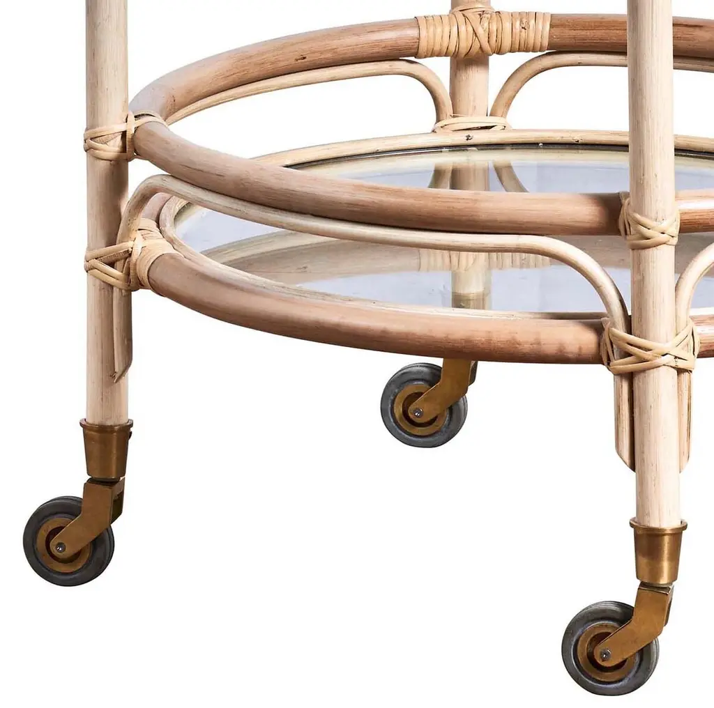 The Romeo Trolley by Sika Design speaks to those who appreciate effortless elegance and practicality. Bringing back the glamour of the 1950s dinner party, the natural rattan trolley showcases graceful organic curves and masterful craftsmanship. Topped with a handle and finished with small brass casters for easy mobility, the versatile design elevates the feel of any space. The Romeo makes a charming bar cart or tea service and adds a classic touch as a side table in the bedroom or living room.
