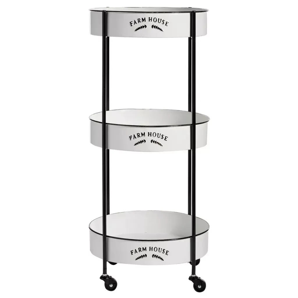 This 3-tier tray on wheels functions as a book cart, fruit basket, or utensil holder. Station it in the kitchen, dining area, bedroom, or library, or roll it to anywhere in the house. This item ships in 1 carton. Cart rolls on four wheels.. Suitable for indoor use only. Some assembly required. Maximum weight limit is 30 lbs. This is a single white colored rolling cart. Iron storage cart features 3 shelves. Farmhouse style. Showcases embossed “FARM HOUSE” typography on front of each tray.