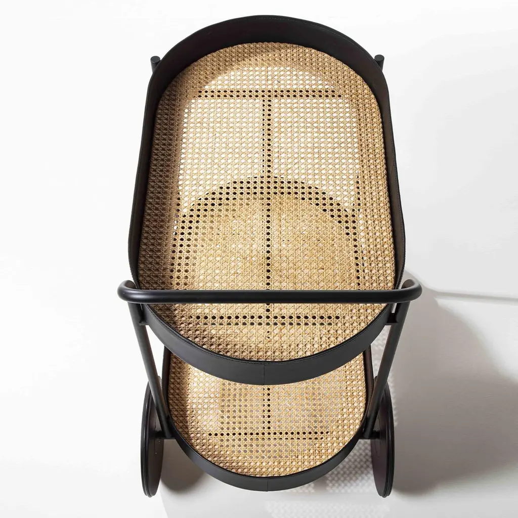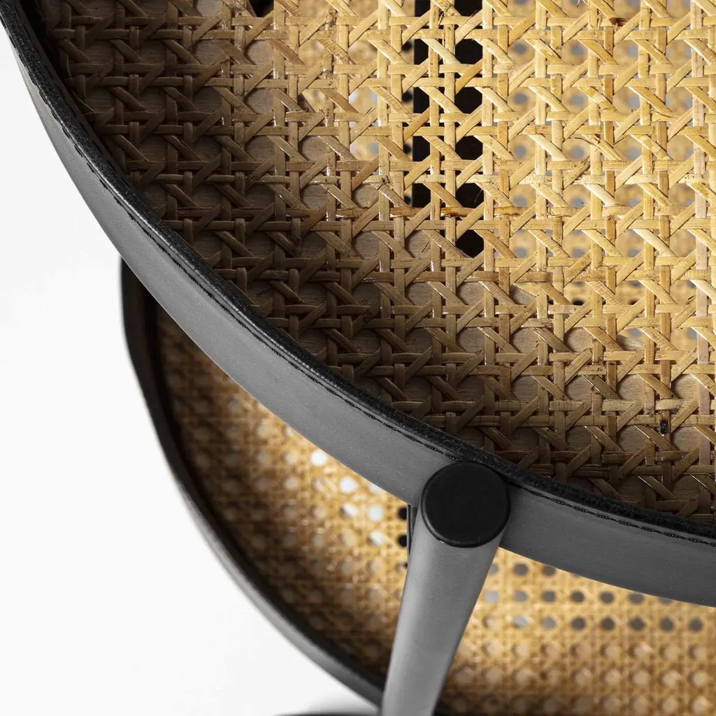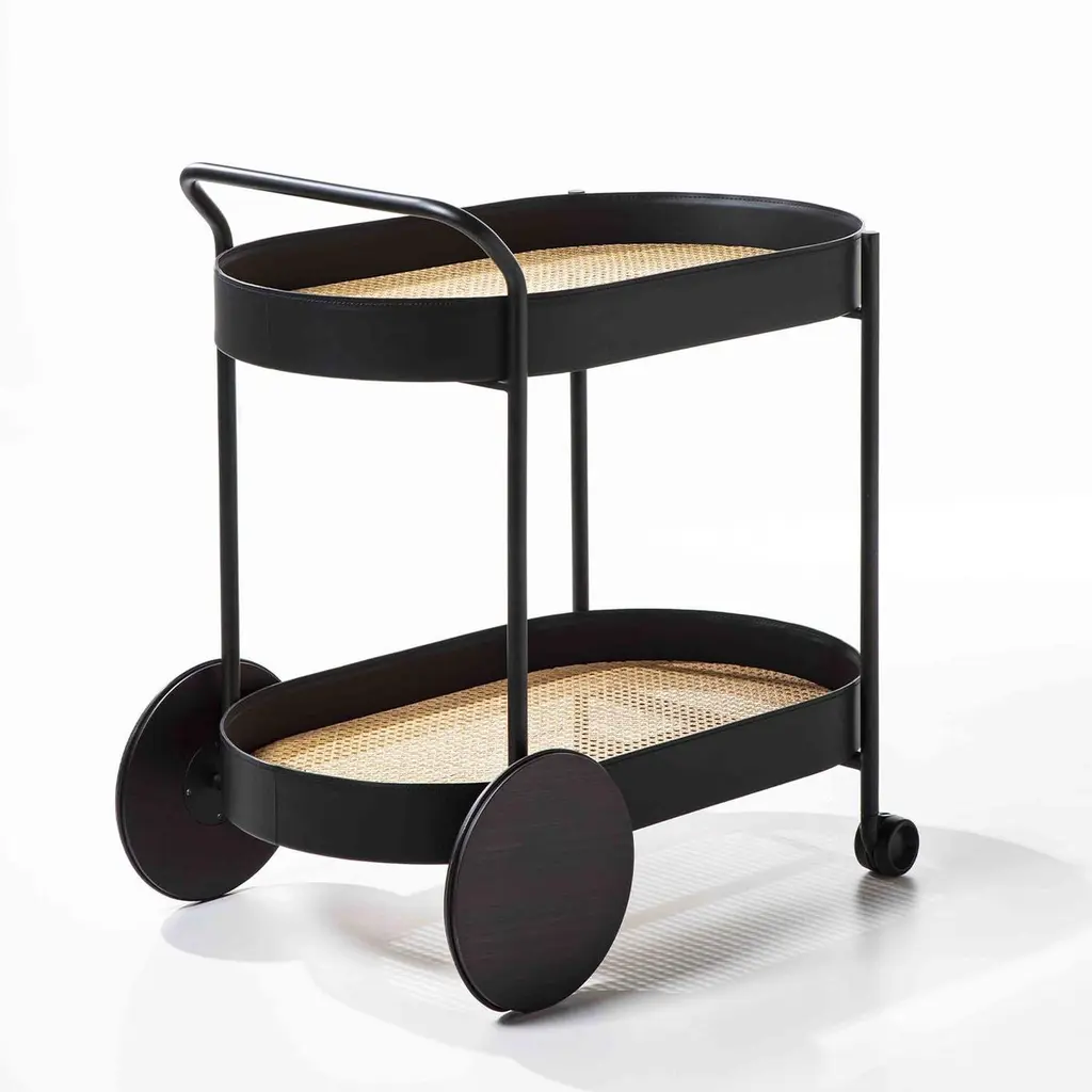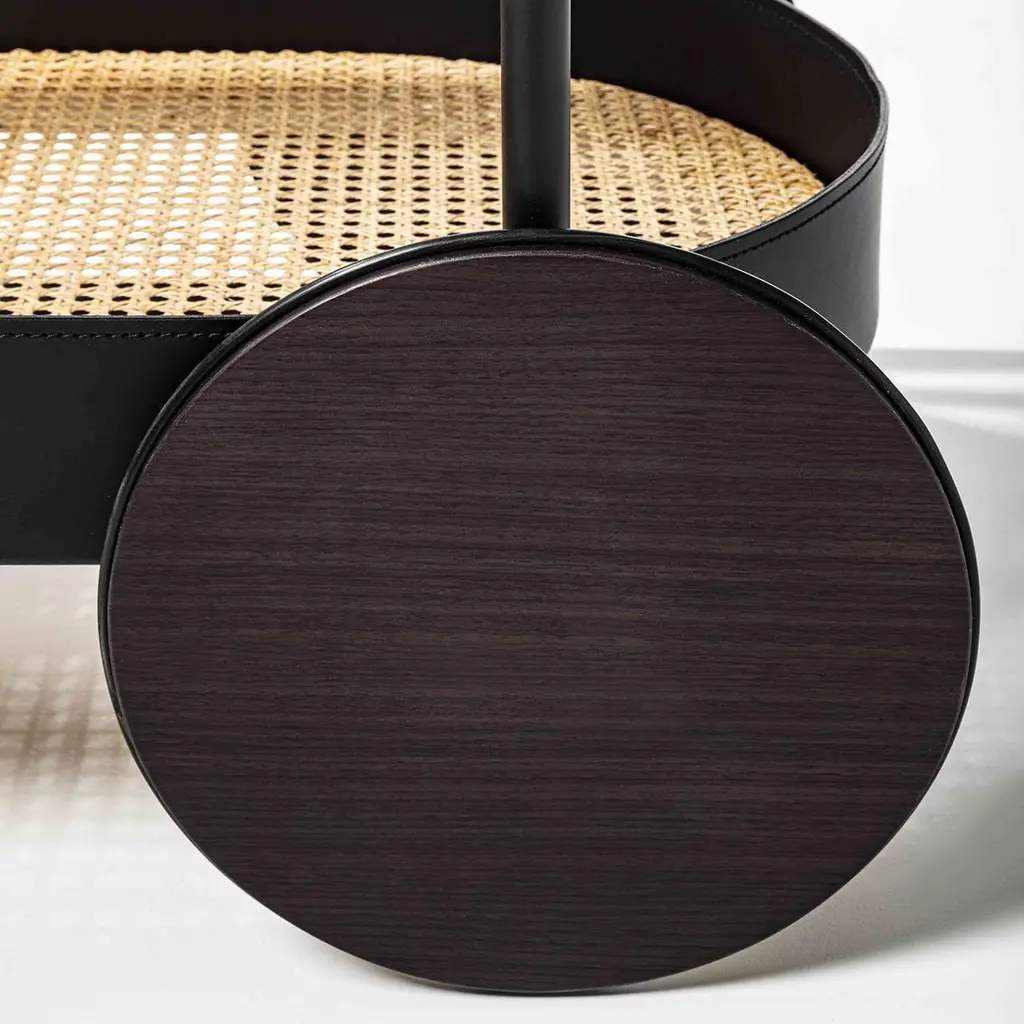 A stylish must-have for entertaining events, this cart is equipped with front and back wheels for easy transportation but works equally well as a static statement topped with a decanter set or flowers in any interior. Finished in matte black, the cylindrical metal frame encloses two Vienna straw shelves (available also in walnut or ash wood) with a tall border covered in black leather for a captivating on-trend look. Leather available in a wide choice of colors, and metal finish offered also in polished brass, bronzed brass, graphite, matte-white, and bronze.