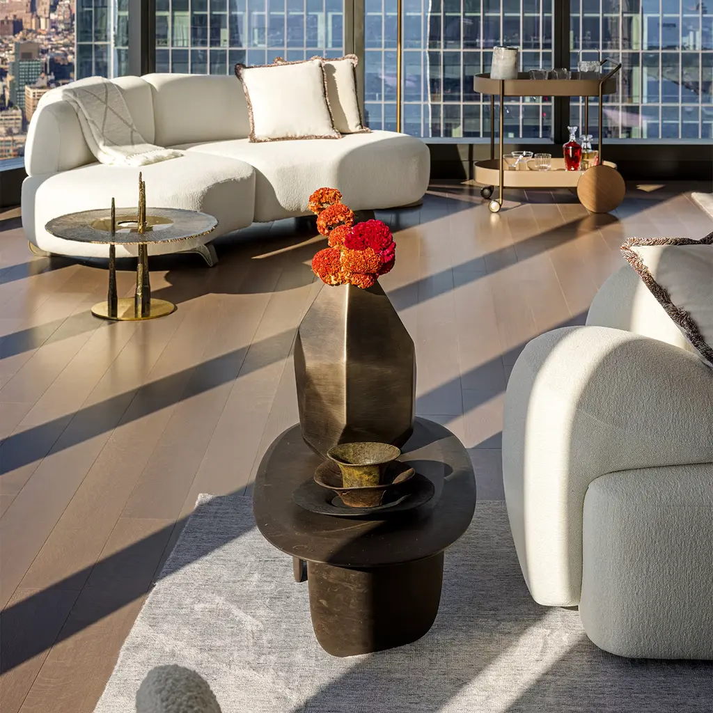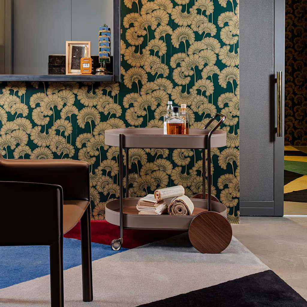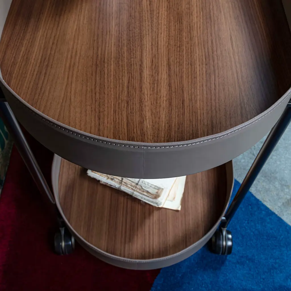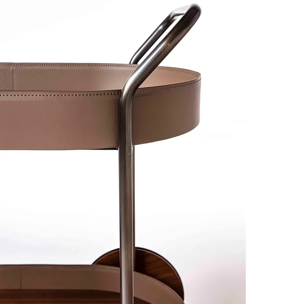 Impress guests with this charming and functional bar cart that perfectly displays your favorite drinks and glassware during formal dinners and parties. Supported by a slender metal frame with bronze painted finish, the two oval shelves feature raised borders covered with matte taupe leather and internal trays of Canaletto walnut wood (pictured), ash wood, or Vienna straw. The back wheels are in the same wood essence for a cohesive look. Leather available in other colors and metal finishes offered in polished brass, bronzed brass, matte black, matte-white, and bronze.