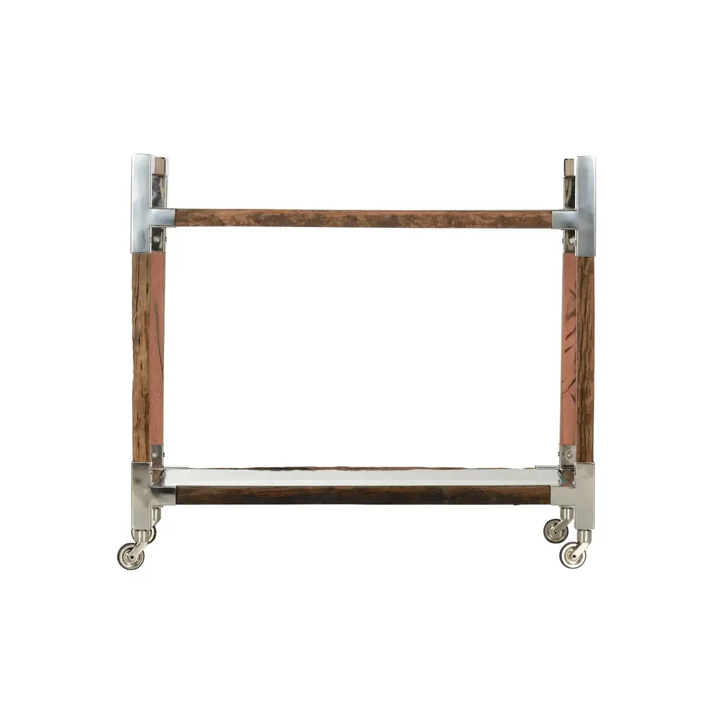 Move the party from room to room with our rustic glam bar cart. Featuring reclaimed natural rough wood with polished nickel corner brackets for visual contrast, its two beveled glass shelves hold bottles, glassware, your favorite decorative accents and more. Casters allow you to transport snacks with ease. Reflect your rustic style by displaying this versatile piece in the kitchen, home bar or entertaining area. Due to the nature of this product; color, knot patterns and grain designs will vary.