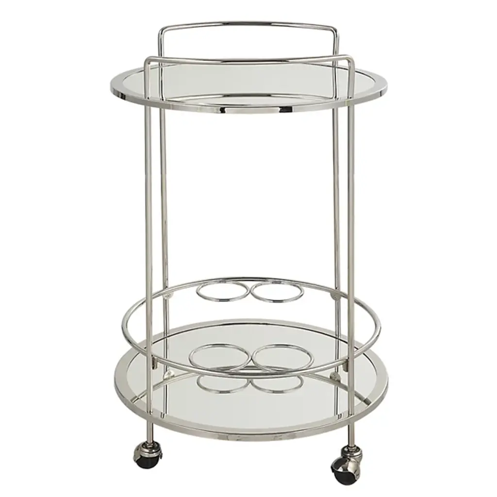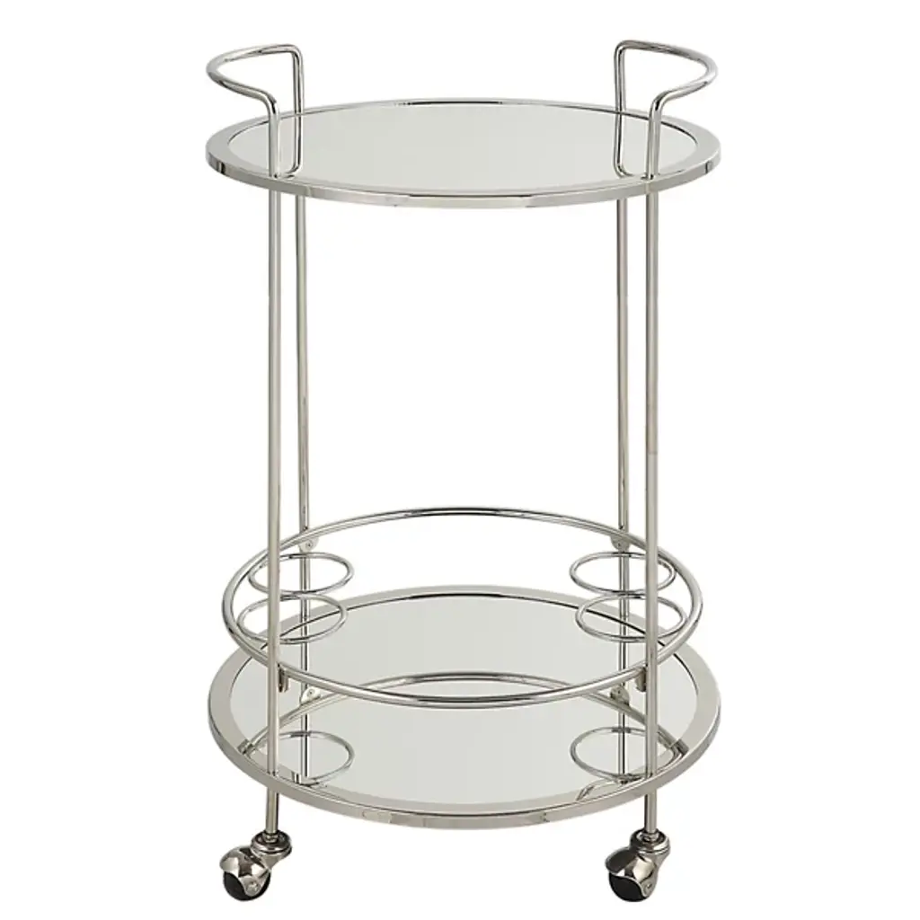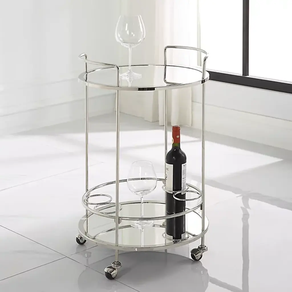 The Spritz Bar Cart from Uttermost is your mobile party companion. This metal cart exudes elegance and functionality. With dual mirrored shelves and ring accents, it offers optimal storage and display space for your favorite beverages and barware, adding a touch of sophistication to any occasion. The petite round frame sits atop caster wheels, enabling easy placement and effortless mobility in any living or dining space. This bar cart brings mid-century modern style to your home.