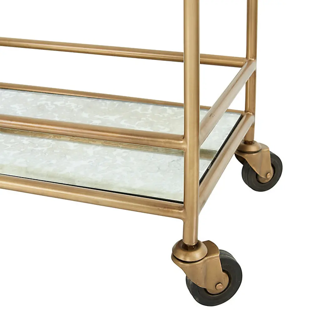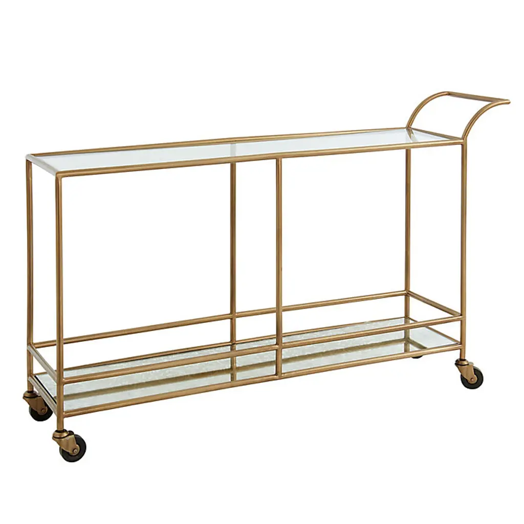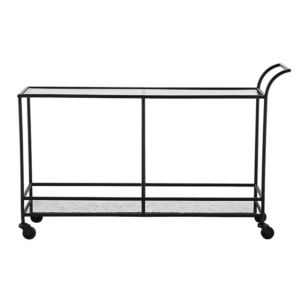 Our Sterling Large Bar Cart long has a clear glass top shelf and antique mirror bottom shelf for over 10 square feet of serving and storage space. Stage one side as a bar and the other for a buffet. The long, slender frame fits neatly behind a sofa, along an entryway wall, or at the end of a wide hall. Sterling Large Bar Cart features: