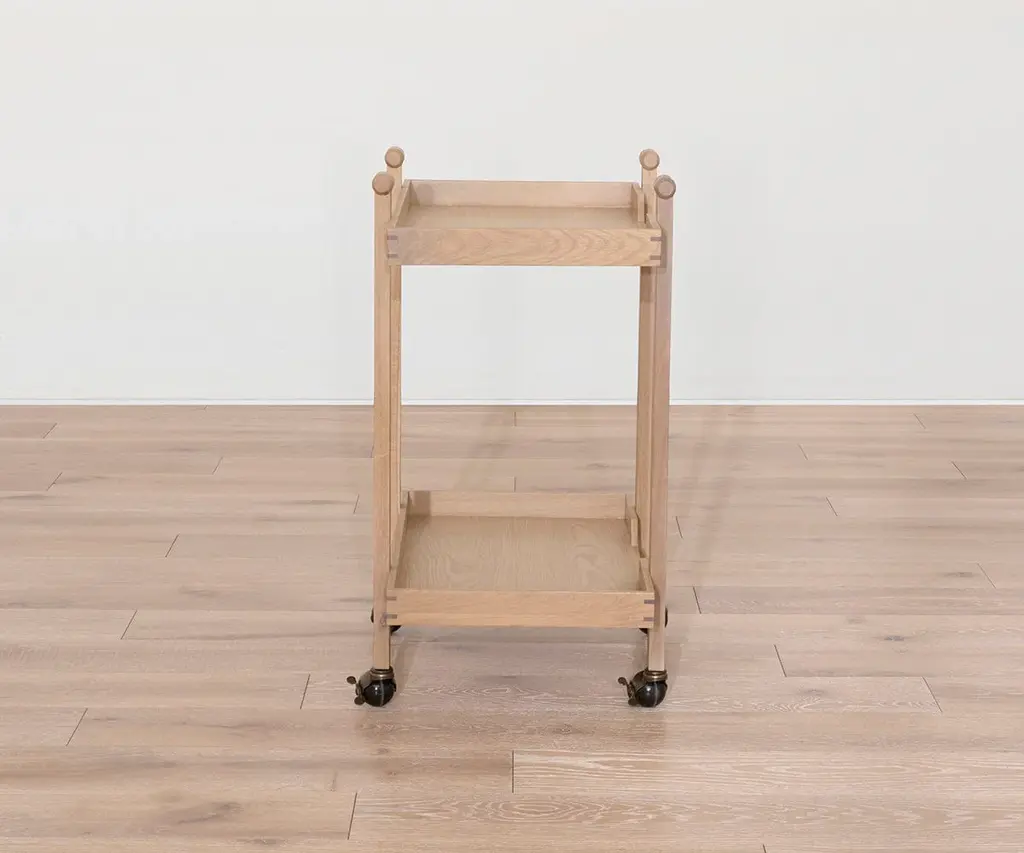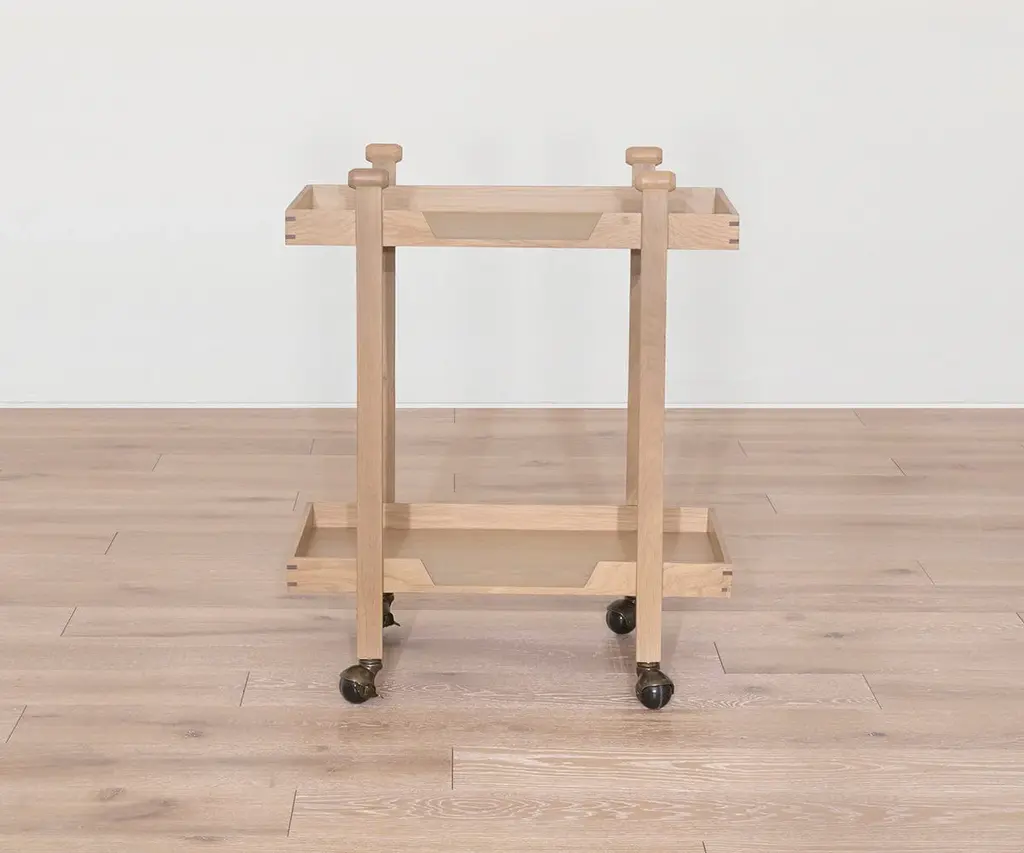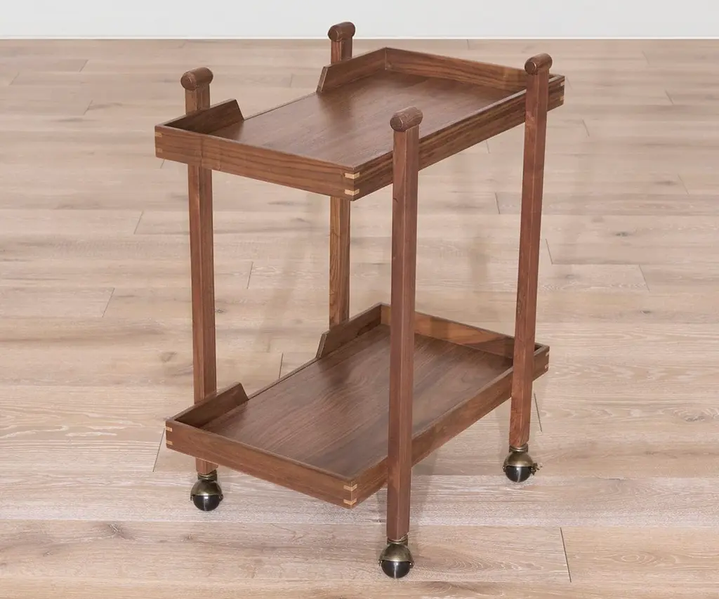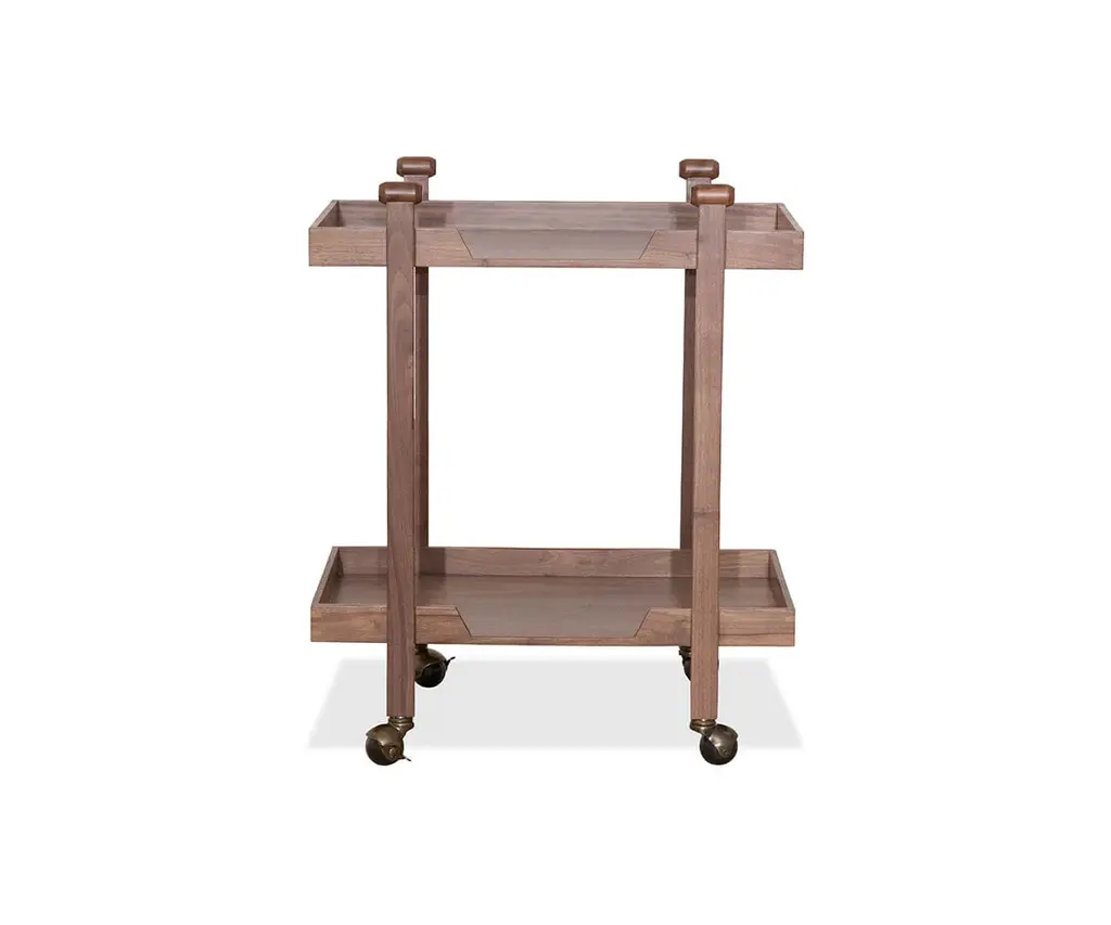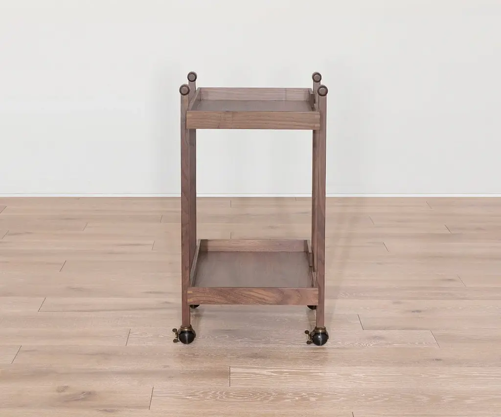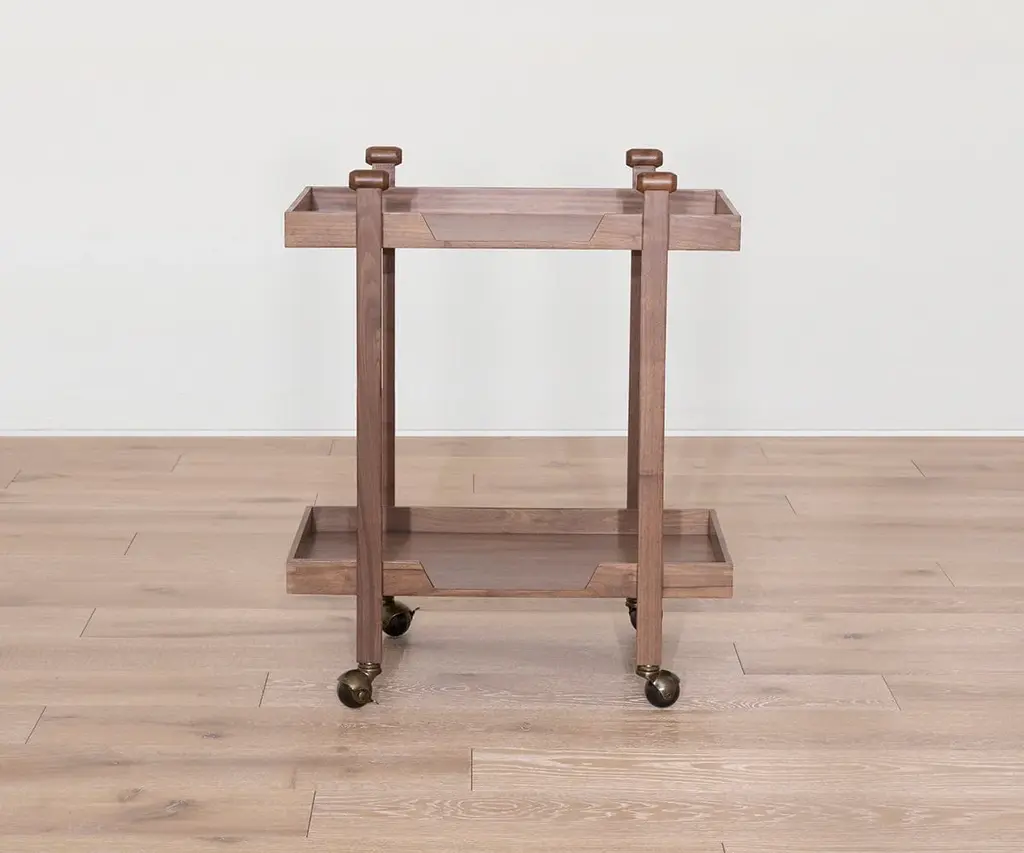 Inspired by a clean, mid-century modern aesthetic with a hint of contemporary style, the Taavi Bar Cart is a portable party in the making (not to mention an excellent value). The gorgeous walnut trayscomplemented by walnut accentsprovide ample space for your serving essentials, while the classic silhouette features a four-legged design finished with beautiful locking casters.