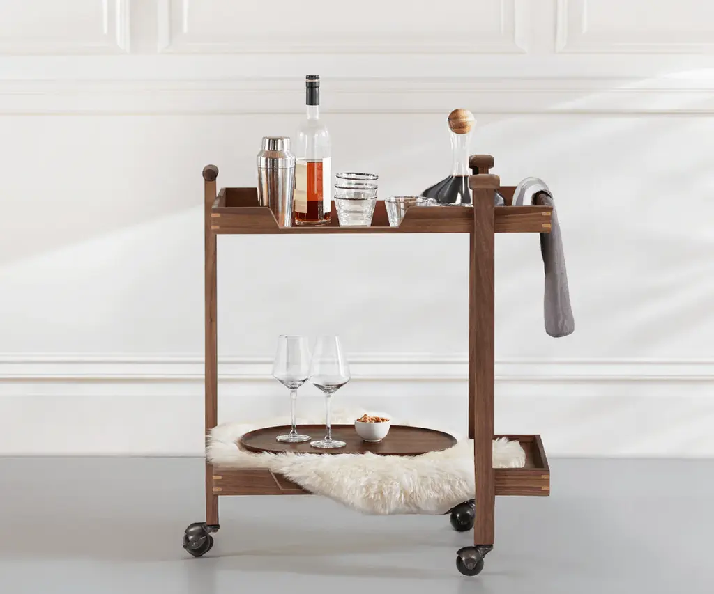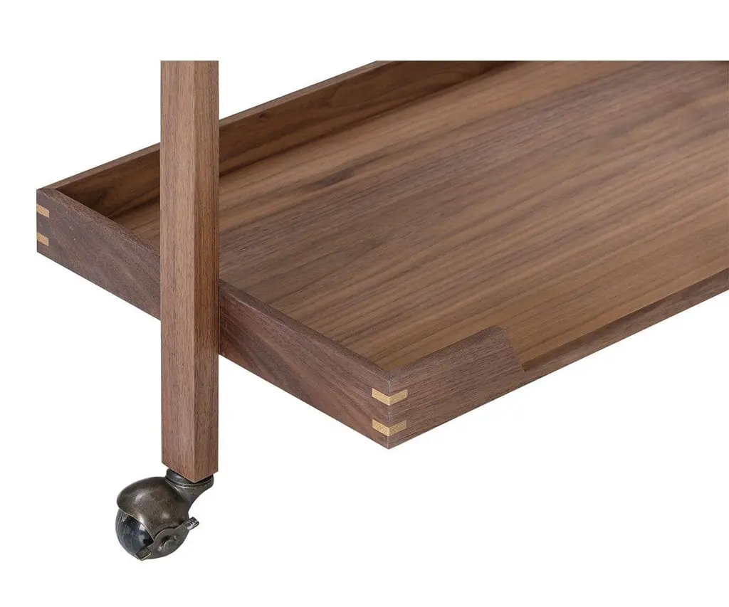 Inspired by a clean, mid-century modern aesthetic with a hint of contemporary style, the Taavi Bar Cart is a portable party in the making (not to mention an excellent value). The gorgeous walnut trayscomplemented by walnut accentsprovide ample space for your serving essentials, while the classic silhouette is set apart by a unique, three-leg design finished with beautiful locking casters.