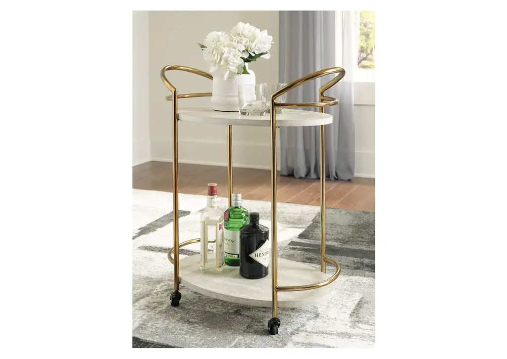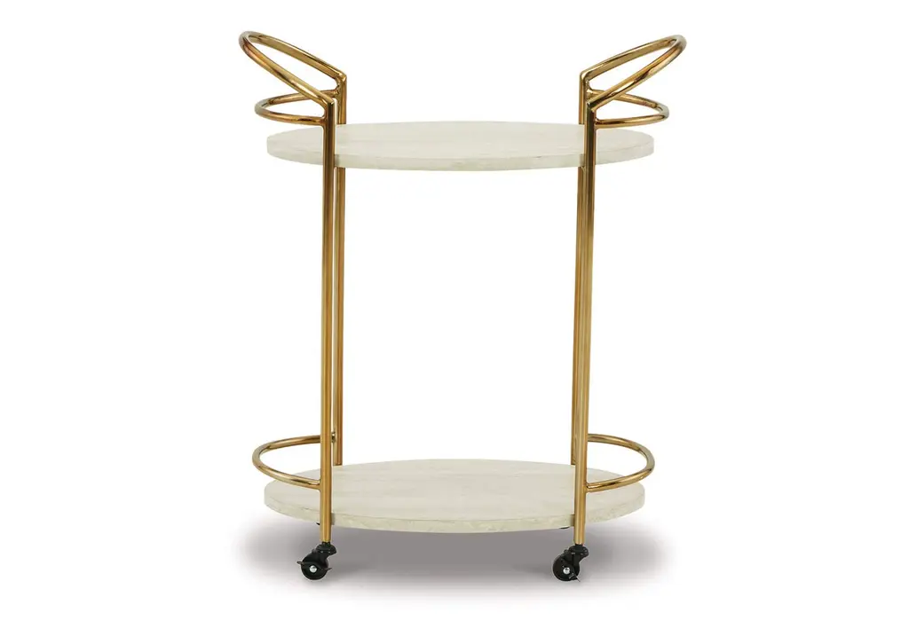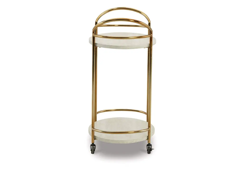 Part furniture, part art form, the luxurious Tarica bar cart is stone cold perfection. Light goldtone metal frames the faux travertine shelves to create a curated look. A stunning showcase of minimalism taken to the max, this decidedly contemporary piece will have you fixated on a modern point of view. Weight 20.000 lbs. (9kgs.)