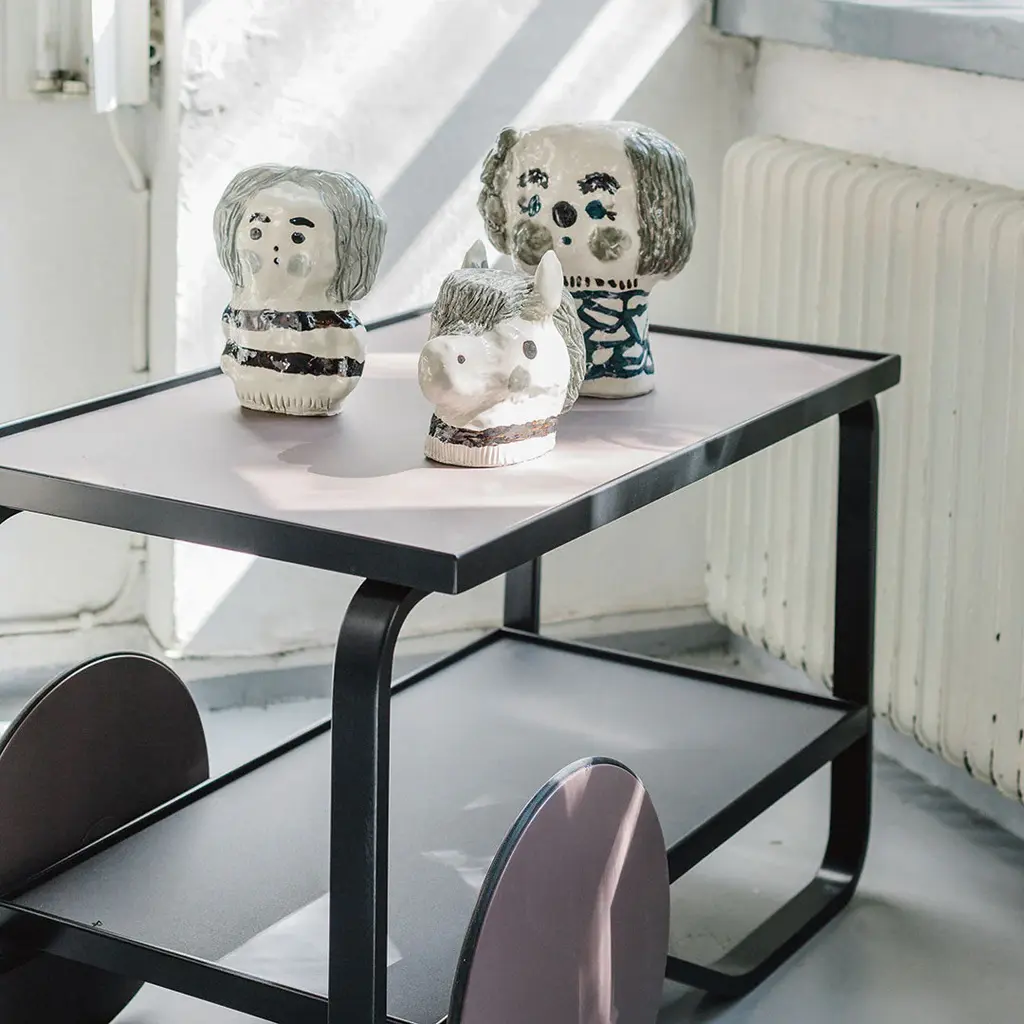 The tea trolley was inspired by British tea culture, which Aino and Alvar Aalto had become acquainted with though their many travels, as well as by the Japanese woodwork and architecture they admired. With a frame composed of two birch lamella loops, Tea Trolley 901 features two shelves and a solid birch handle. Twin wheels, in combination with the lightweight quality of birch, mean the trolley can be easily maneuvered and parked at will. Over the years, numerous variations of the Tea Trolley have been produced. Dutch designer and colour expert Hella Jongerius delved into Artek's archives to offer her own take on one of Alvar Aalto's most cherished products. Her subtle interventions resulted in a light and a dark version of the trolley, which play with the shifting light on the product's upper and lower trays.