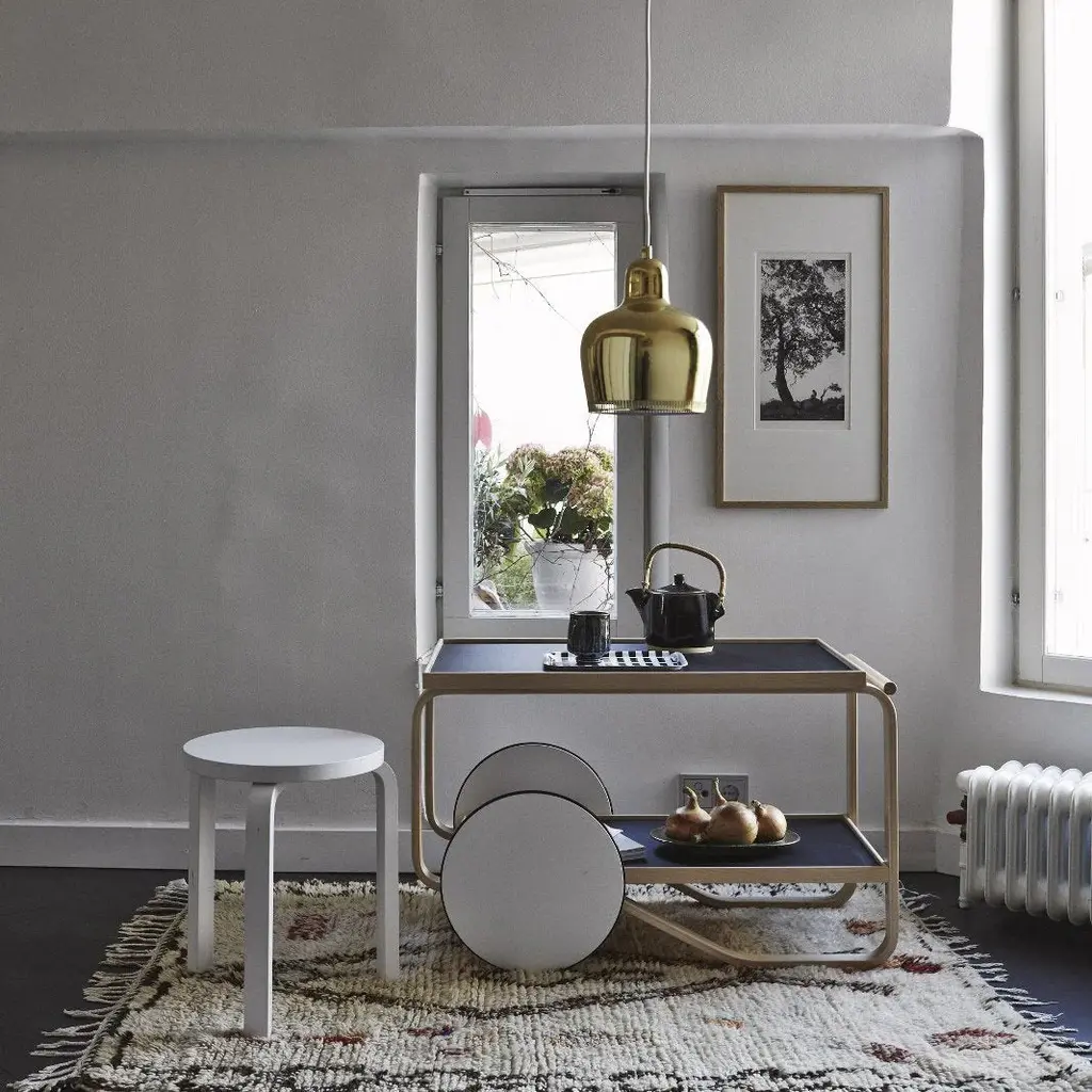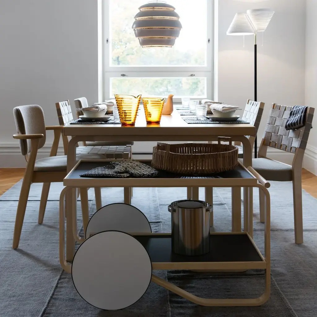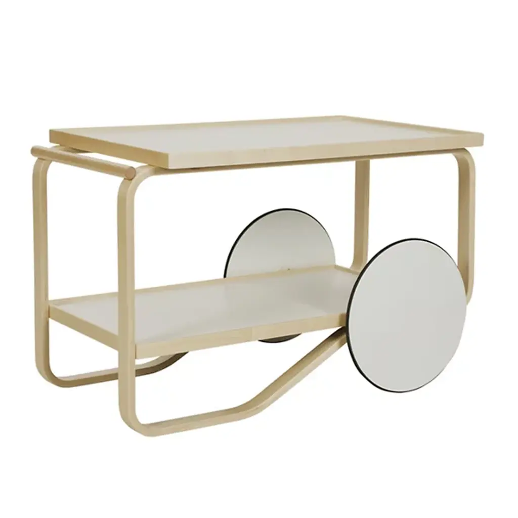 The tea trolley was inspired by British tea culture, which Aino and Alvar Aalto had become acquainted with though their many travels, as well as by the Japanese woodwork and architecture they admired. With a frame composed of two birch lamella loops, Tea Trolley 901 features two shelves and a solid birch handle. Twin wheels, in combination with the lightweight quality of birch, mean the trolley can be easily maneuvered and parked at will. Over the years, numerous variations of the Tea Trolley have been produced. Dutch designer and colour expert Hella Jongerius delved into Artek's archives to offer her own take on one of Alvar Aalto's most cherished products. Her subtle interventions resulted in a light and a dark version of the trolley, which play with the shifting light on the product's upper and lower trays.