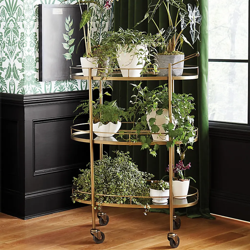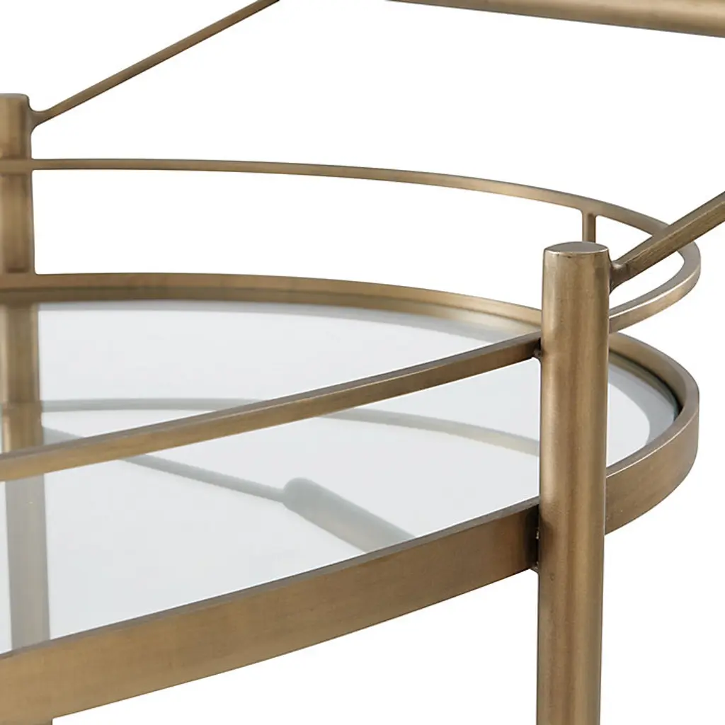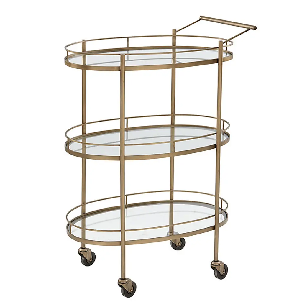 Raise the entertaining bar with our statuesque Tessa Tall Bar Cart. The taller oval metal frame features three glass shelves with slender galleries, and enough space for bottles and glassware to serve a crowd. Extra height makes pouring and mixing like a pro easy. This rolling bar cart has casters than swivel a full 360 degrees, so you can bring the fun to the center of the party. Tessa Tall Bar Cart features: