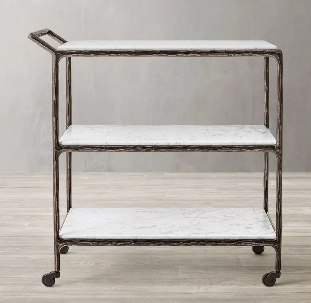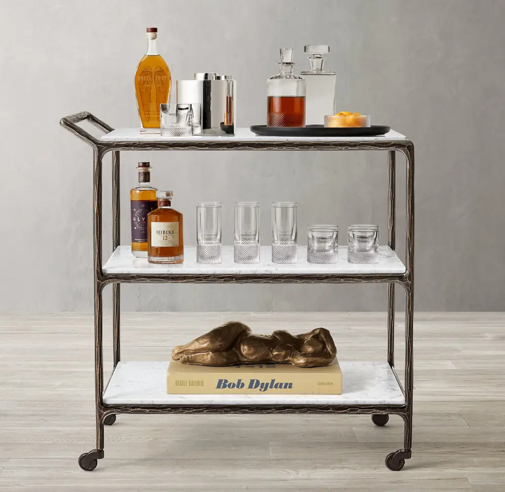 Inspired by the sculptural works of Salvador Dalí and Diego Giacometti, our collection by Julie Lawrence merges the rustic sensibility of hand-forged metal with clear tempered glass shelves. Employing an ancient fabrication process, artisans hand hammer the metal bars to reveal an alive, imperfect and organic texture, a counterpoint to the frame's slender, tapered silhouette. SHOP THE ENTIRE COLLECTION