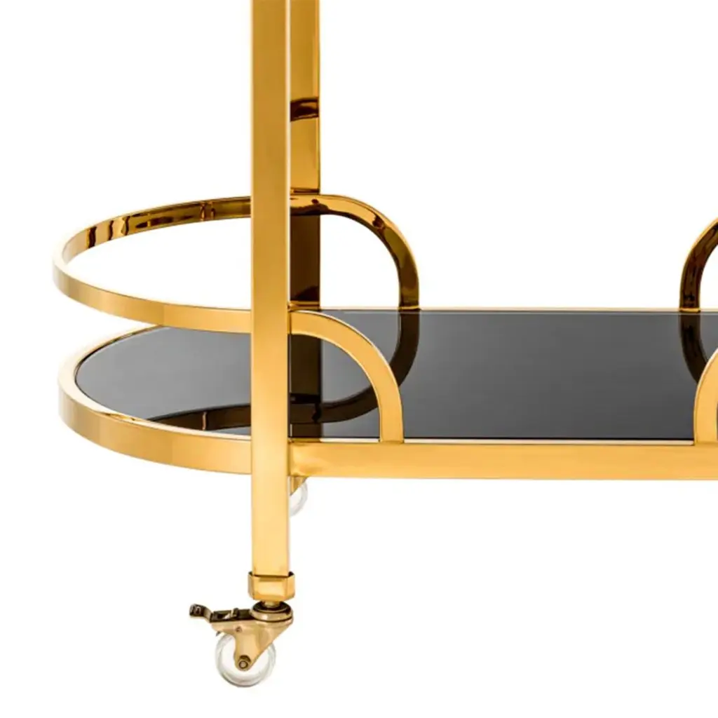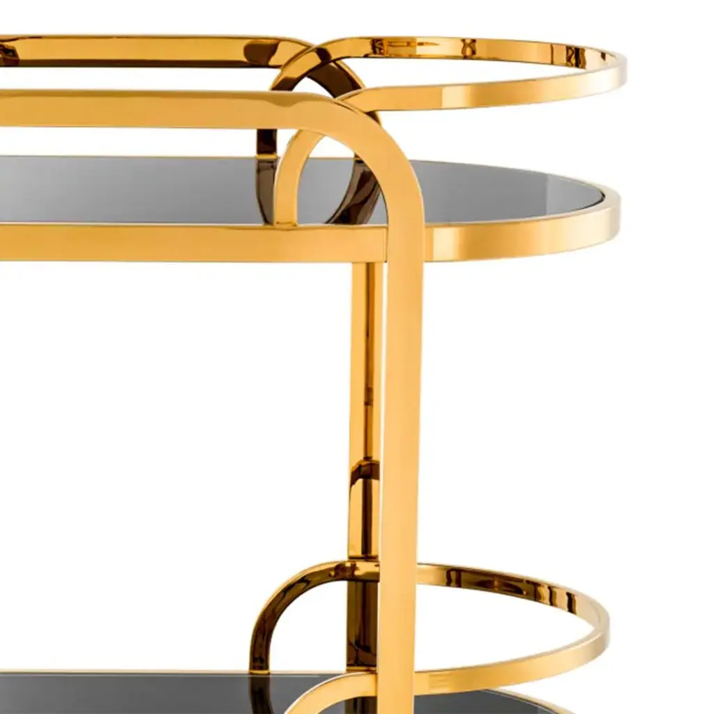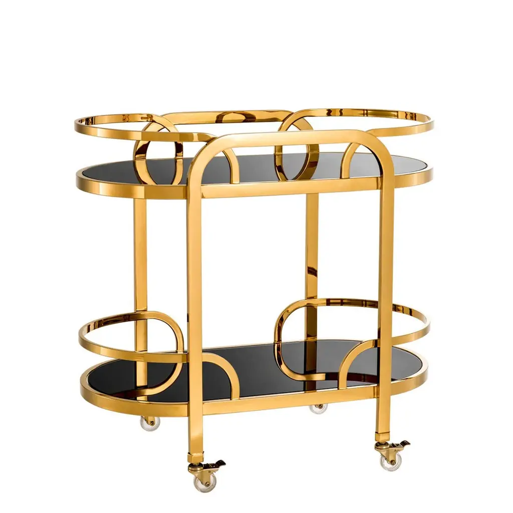 Trolley Tommy ith all structure in polished stainlesssteel in gold finish. Up and down tops in smocked glass. With 4 clear acrylic rotative castors.
