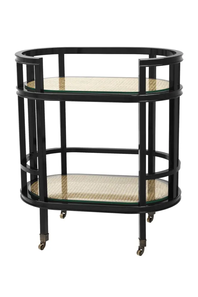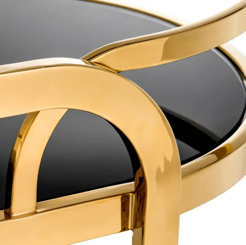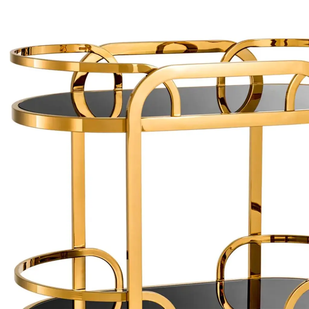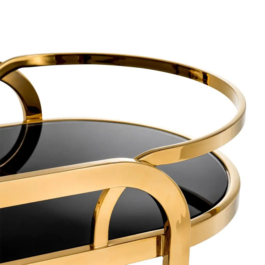 Trolley Tommy ith all structure in polished stainlesssteel in gold finish. Up and down tops in smocked glass. With 4 clear acrylic rotative castors.