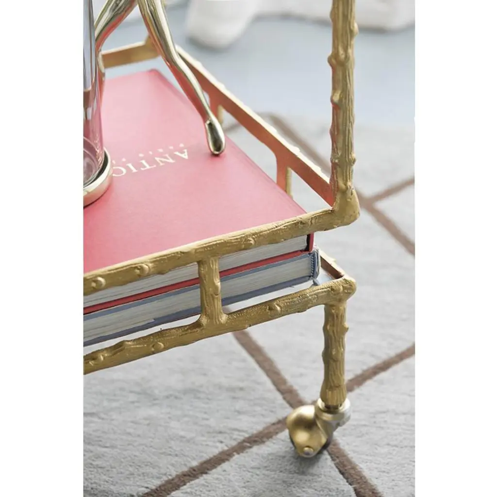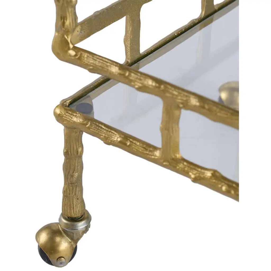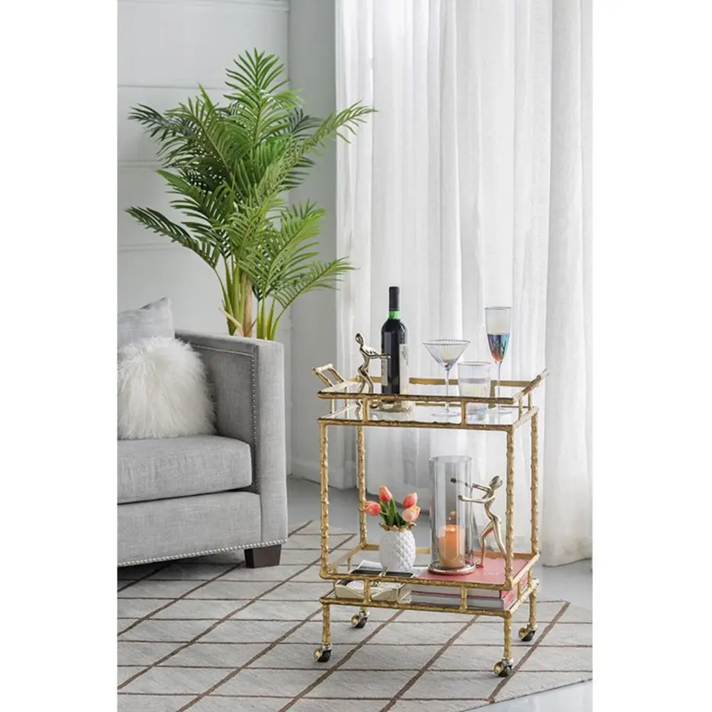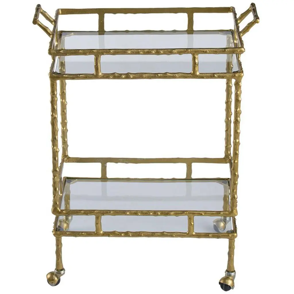 Entertain like a professional with the attractive functionality and thoughtful design of this silver bar cart, which comes in a brass antique finish. This two-tiered bar cart is made of aluminum and glass, and also features two shelves and a handle on each end for easy mobility. It looks amazing in the kitchen, living room, or dining room when its not in use.