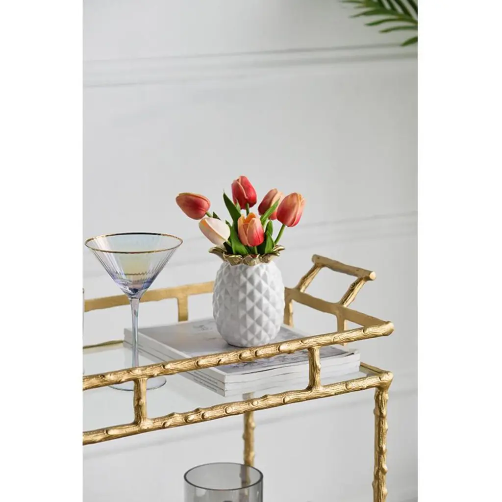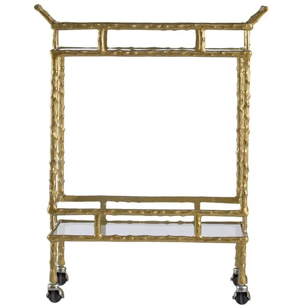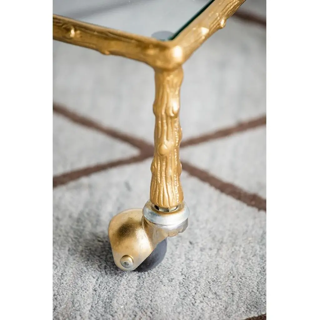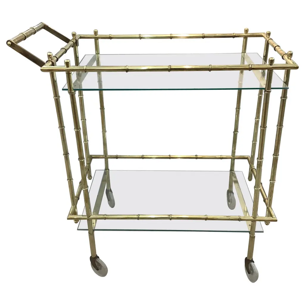 Entertain like a professional with the attractive functionality and thoughtful design of this silver bar cart, which comes in a brass antique finish. This two-tiered bar cart is made of aluminum and glass, and also features two shelves and a handle on each end for easy mobility. It looks amazing in the kitchen, living room, or dining room when its not in use.