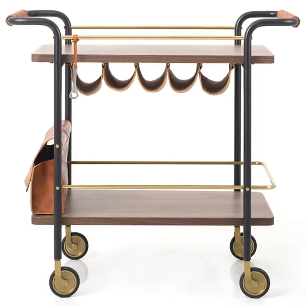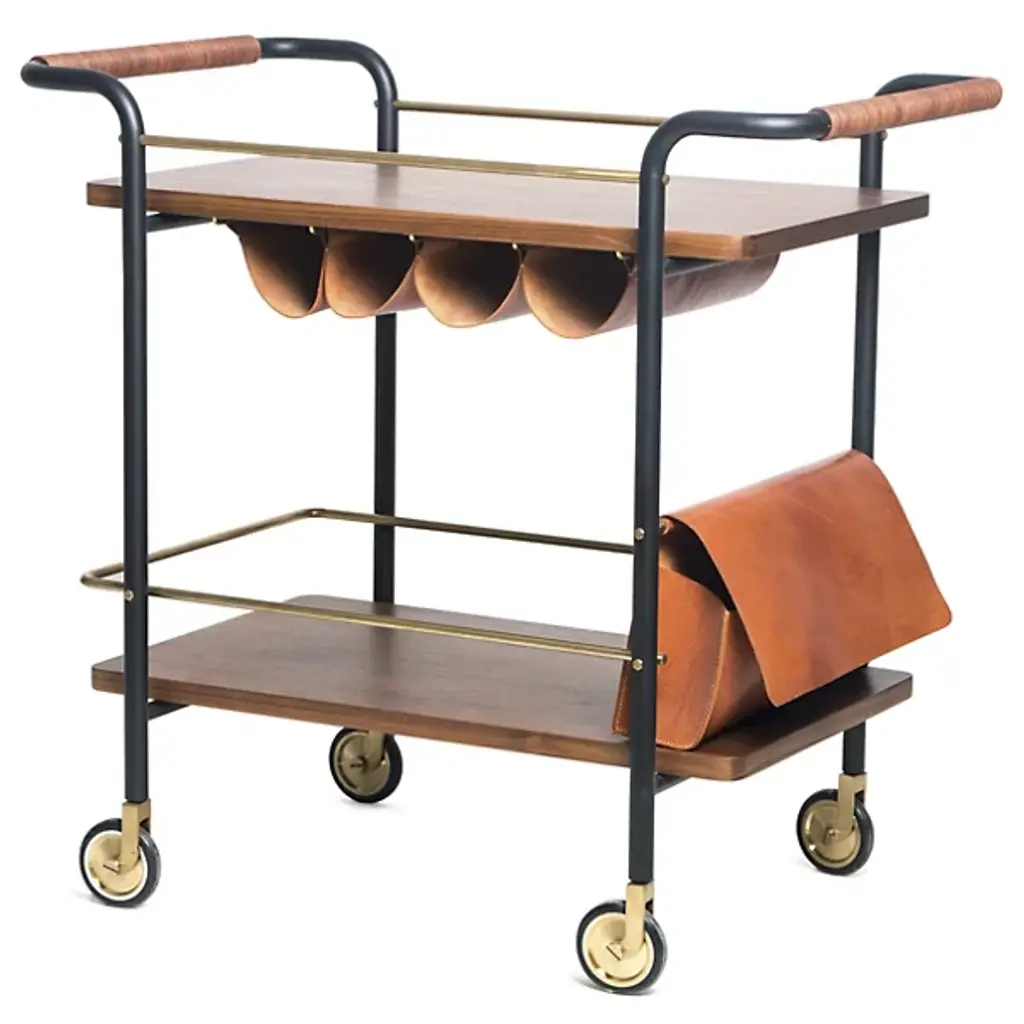 Rustic charm with modern sensibilities. The Valet Bar Cart from Stellar Works features a streamlined look with luxurious functionality. With a beautiful mix of materials, from leather to wood, this bar cart redefines the word “valet,” meaning servant or attendant, for the 21st century home. Designed by the Rockwell Group, this bar cart showcases a smooth upper surface on which to mix cocktails and a matching lower surface to keep glasses, shakers, ice buckets, and more. Underneath the upper surface is a row of leather wine cubbies, so you can always have your next bottle at hand. The four wheels at the ends of the legs let you maneuver this cart around your home as you entertain your guests.