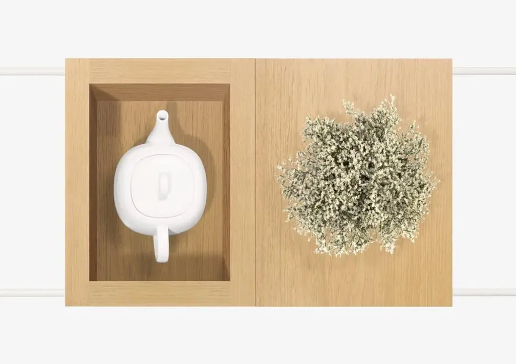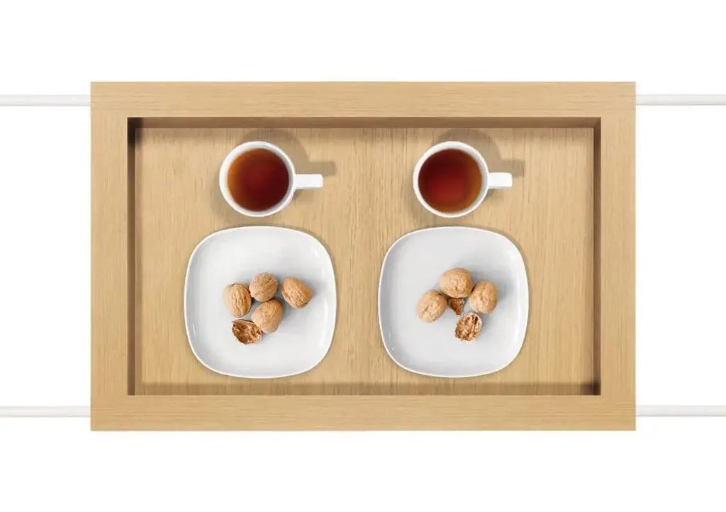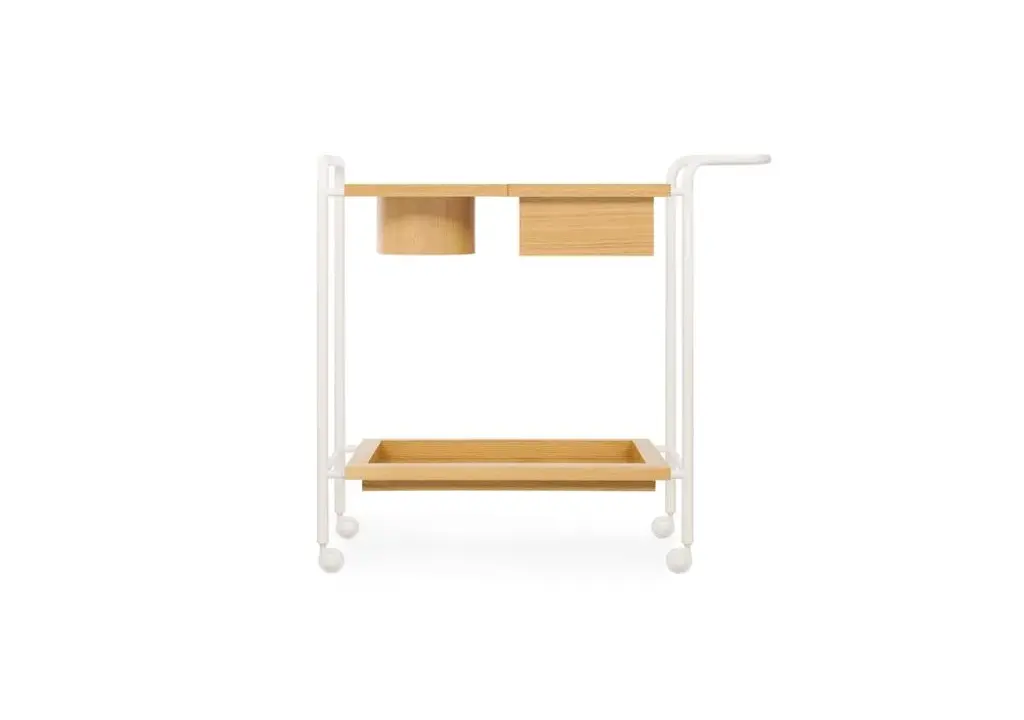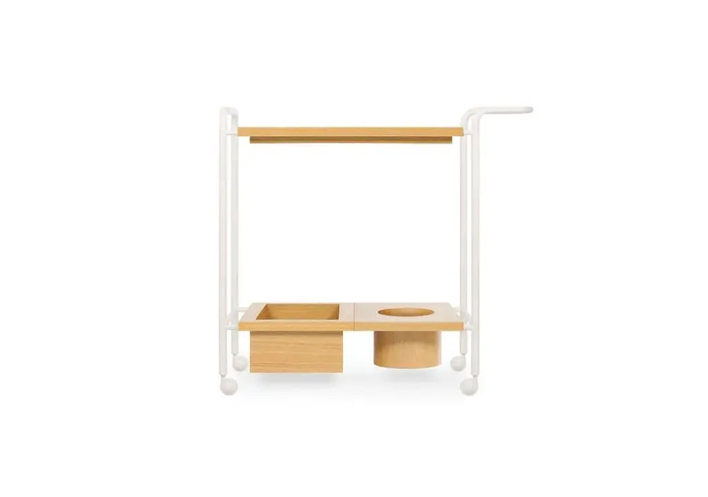 Tea trolley composed of 1 lacquered steel structure and 3 tops in solid oak wood and MDF veneered with natural oak leaf. The Living tops have a recess that allows a simple fit into the structure and you can easily change the order of placement. This set includes: 1 Tea trolley structure - Lacquered steel - White 1 Large tray - Oak wood - Natural 1 Box - Oak wood - Natural 1 Small pot - Oak wood - Natural - Includes 1 round vase