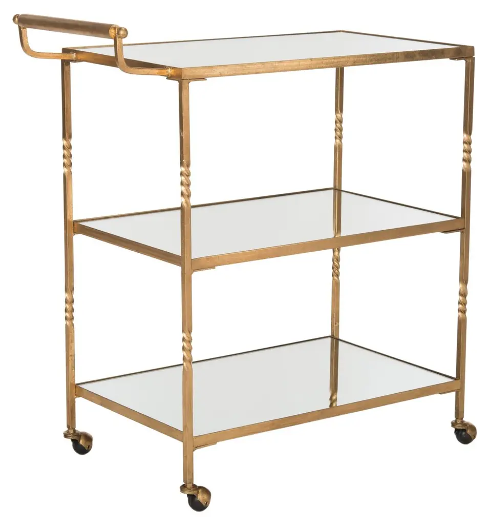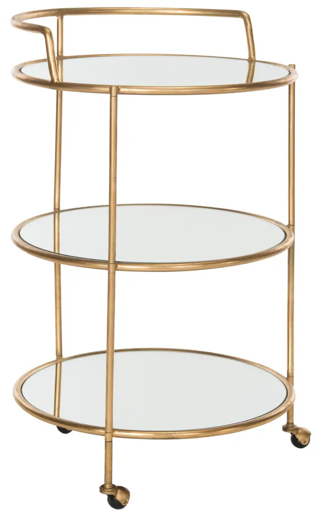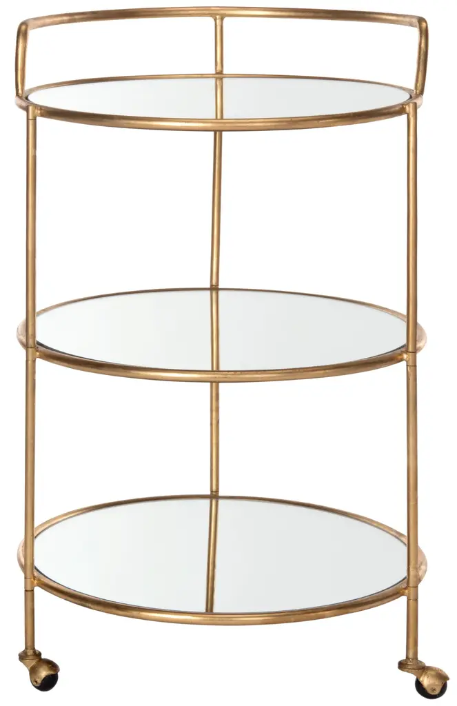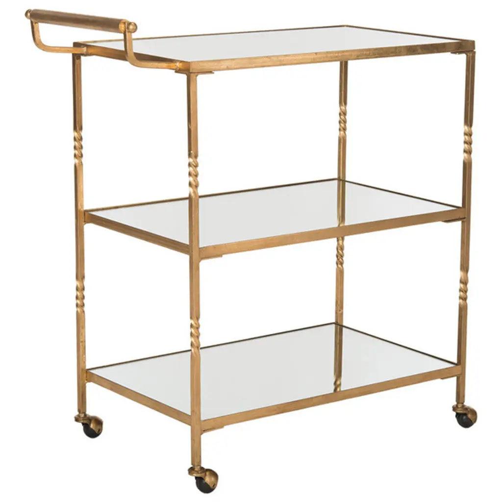 Designed for the hippest of hostesses, the diminutive bar cart is the solution to service in small spaces.With mirrored glass shelves, chic steering handle and casters, this cart is crafted of sturdy iron with a lustrous gold finish. Dust with a soft, dry cloth. Do not use abrasive cleaner. To clean mirror/glass, spray a small amount of glass cleaner onto a lint-free cloth and wipe mirror/glass clean. Some assembly required.