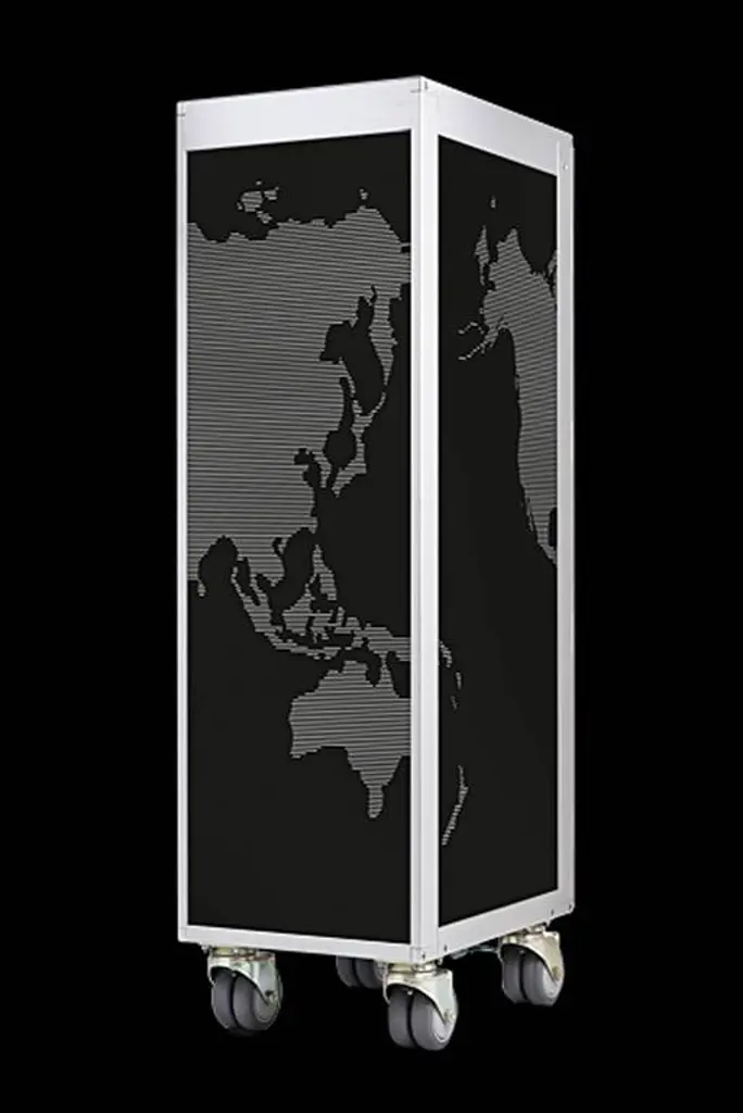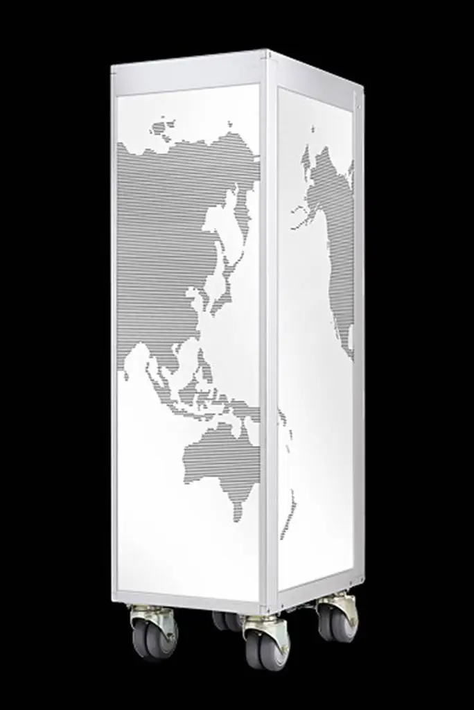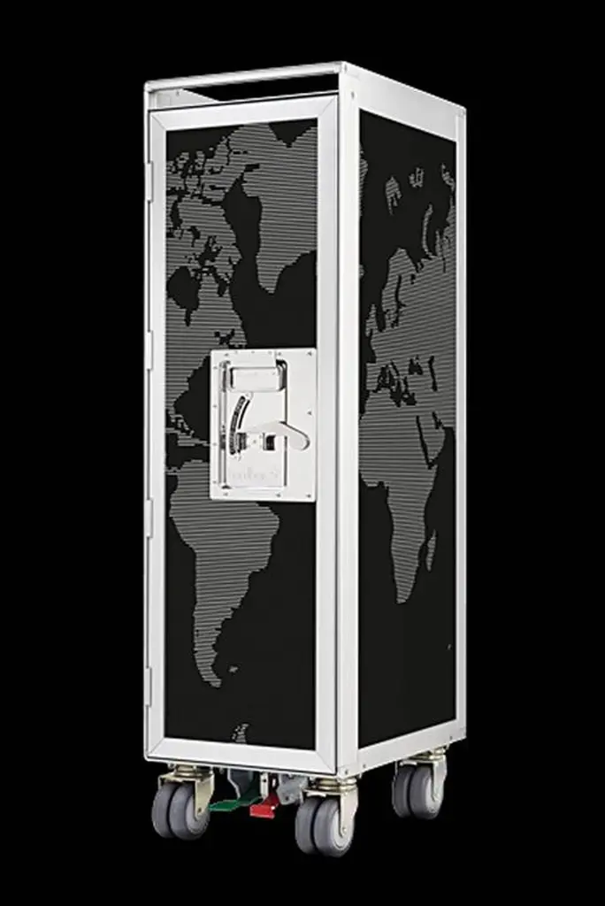 Aircraft bar trolley world black, unique design, with world map.Available on black or white background, trolley on wheels.With 1 drawer in anodized aluminium and with 3 shelves in aluminium dibond compound material included.Trolley Airport Black, Price: 4900,00€or Trolley Airport White. Price: 4900,00€With optional extras for the interior of the trolley, on request:Cover plate in felt dark grey or light grey, price: 30,00 €Chopping board, price: 220,00 €Dibond aluminium top, price: 80,00 €Drawer in anodized aluminium, price: 80,00 €Drawer synthetic material, semi-transparent, price: 45,00 €Cutlery tray for drawer sturdy polysyrene alu metallic, price: 30,00 €Pencil tray frame in black aluminium, price: 85,00 €Shelf for bottles in aluminium compound material, price: 80,00 €Shelf in aluminium dibond compound material, prix: 45,00€Shelf in glass all edges are smoothed, price: 60,00 €Shelf for Nespresso capsules in dibond aluminium, price: 80,00 €LED shelf multicolored shelf in glass with remote control, price: 490,00 €Cooler fridge with glass door, price: 890,00 €