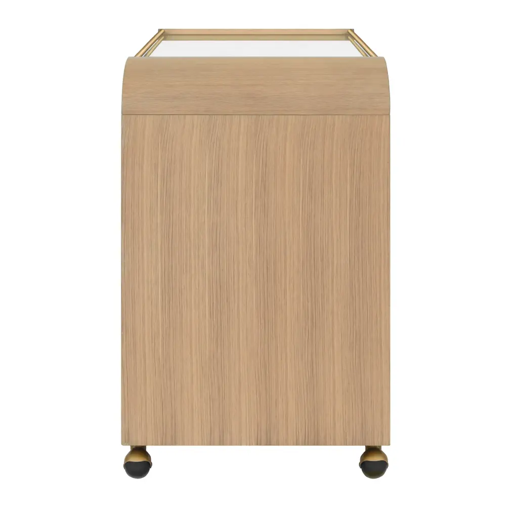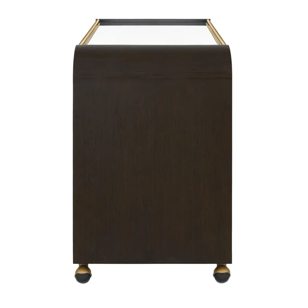 Simple yet sophisticated, the Worlds Away Myer bar cart makes entertaining a breeze. Featuring a waterfall edge with antique brass rails in natural oak or expresso oak. Rolling casters give you the flexibility to move the party from lounge to poolside in minutes.