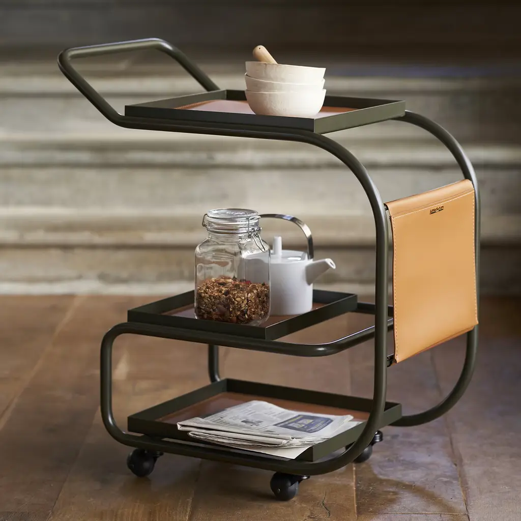 This superb bar cart is perfect for serving tea or sharing a drink with guests after a long day or on a relaxing weekend. Its tubular steel frame finished in a dark-green lacquer boasts a sinuous shape where three rectangular trays are fitted - one of them removable. Equipped with wheels for easy carriage, the design is completed by a practical pocket fashioned of the same prized, restored leather used to upholster the trays' bottoms.