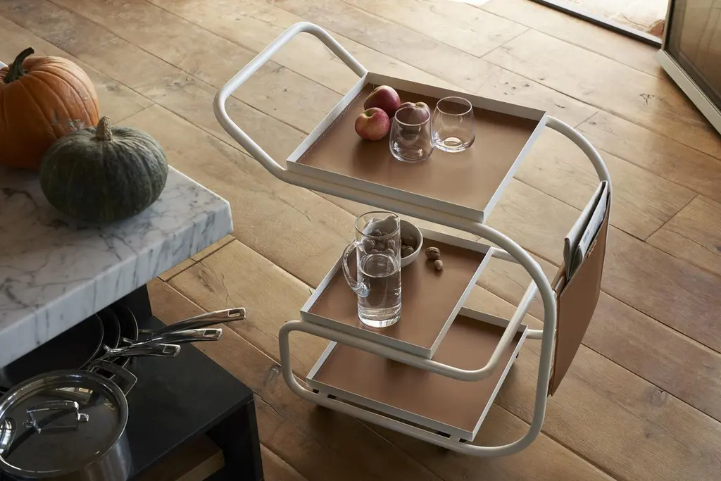 A trolley, a bar cart, an independent workstation… Zenzero is surprising, peppery, engaging, it is hospitality on wheels.Three steel trays are supported by a sinuous structure made of thin steel tubes, with a convenient pocket in regenerated leather placed on the front, while the handle and pivoting wheels make this inherently nomadic item even easier to move.Designed to safely contain and transport bottles and glasses, cups and jugs (or whatever tickles your fancy) Zenzero can turn into a completely independent work station for preparing and serving food and drinks at any time, also thanks to the two practical removable trays.Functional for breakfast, fun for the aperitif, stylish for an after-dinner liqueur, Zenzero designed by Samer Alameen, is perfectly suited to all contexts where good living is considered a value, as well as a pleasure.Handy and captivating with its three finishes – minimalist in white, impeccable in dark green, sophisticated in gold leaf – it fits nicely in any environment. Perfect as a working tool to ensure safety and privacy in the most exclusive lounges and refined restaurants, it can also be an attractive fixture for professional practices or private homes.Incredibly versatile, Zenzero will charm even the most expert and demanding connoisseurs.Additional Information: Materials: Steel, natural leatherFinish: Matt whiteDimension: W 72 x D 41 x H 81 cmAvailable in other color option: Matt green and glossy gold leaf
