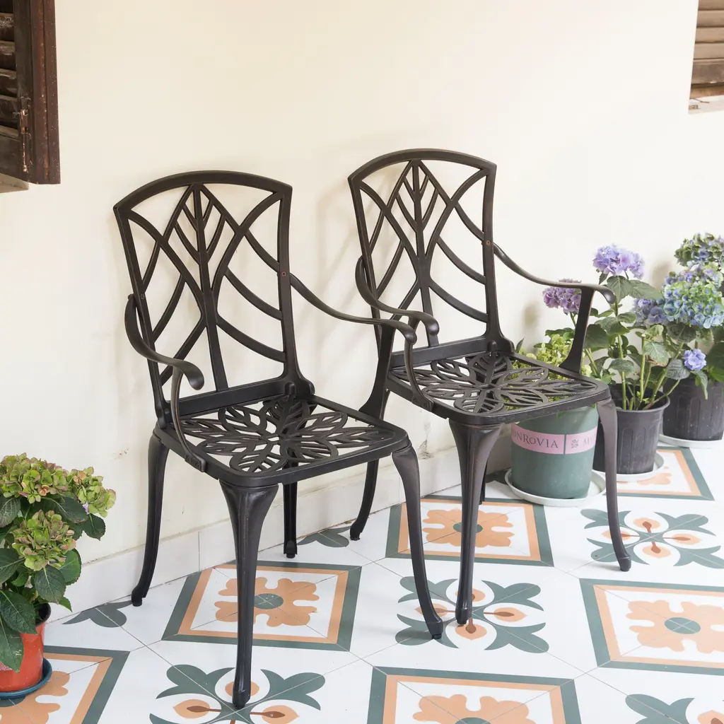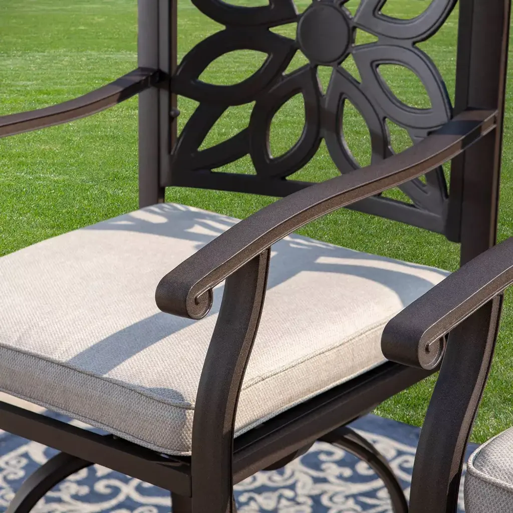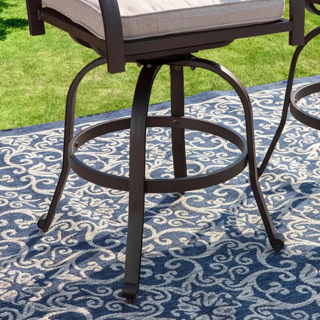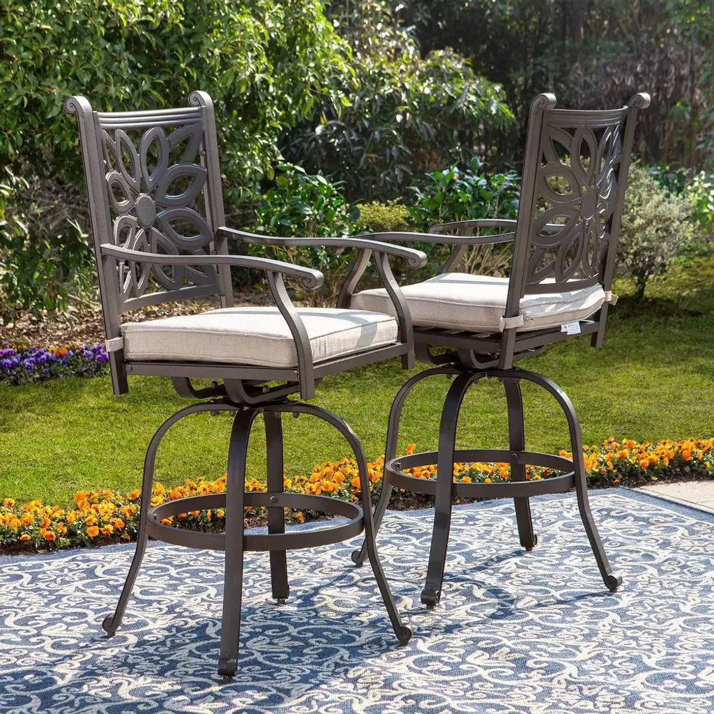 [CAPTIVA DESIGNS] Elevate your outdoor dining experience with our 2-pack of Swivel Bar Stools, seamlessly blending modern design with timeless elegance. Crafted by hand for durability, these 360°Swivel chairs feature thick cushions for ultimate comfort. Constructed with the sturdy E-coating and powder-coated cast aluminum and a weather-resistant finish, the large seats ensure a cozy dining ambiance. Relax and dine in style with these durable and comfortable chairs designed to withstand the elements.FEATURESComfortable Cushions: Thick seat cushions for ultimate comfort.360° Swivel chairs: U-curve armrest, 3 steel bottom brackets, and triangle structure.Sturdy Metal Construction: Reliable and durable cast aluminum frame construction.Modern Design with Classic Appeal: Blending modern style with timeless elegance.Weather-Resistant Finish: E-coating and powder-coated finish to resist rust and water damage.SPECIFICATIONBar Stool: 48.8"H x 25.6"W x 27.2"D, 21" (seat back height)Seat Dimensions: 22"W x 23.2"D, Thickness: 3.5"Floor to seat top: 27.8" [cushion not included]Floor to armrest: 36.5", Floor to foot ring: 12.6",Weight: 29.5 lbsPackage Includes2 x bar stools (1 box)Instruction Manual (come with the box)Tips: Allow all the holes in the section to line up correctly and then tighten the screws. Assembly: 40 minutes to put the bar stools together.