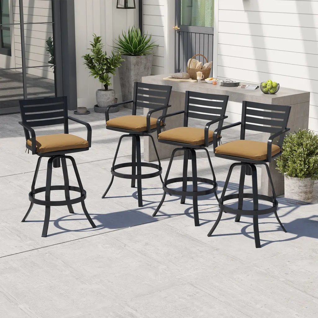 The patio swivel bar stools are made of sunbrella fabric and sturdy powder-coated cast aluminum frame,each patio bar stool weight capacity holds up to 300 lbs. The sunbrella fabric features 100% solution-dyed acrylic, 5 years non-fading top. The armrest and backrest design of the bar stools are curved and designed to be ergonomic.These stools boast swivel seats for freedom of movement and come with soft cushion for added comfort.Fit various occasions: The patio bar stools can be used in patio, outdoor,garden, bar,park, porch, poolside and yard but also suitable for indoor, kitchen, living room.