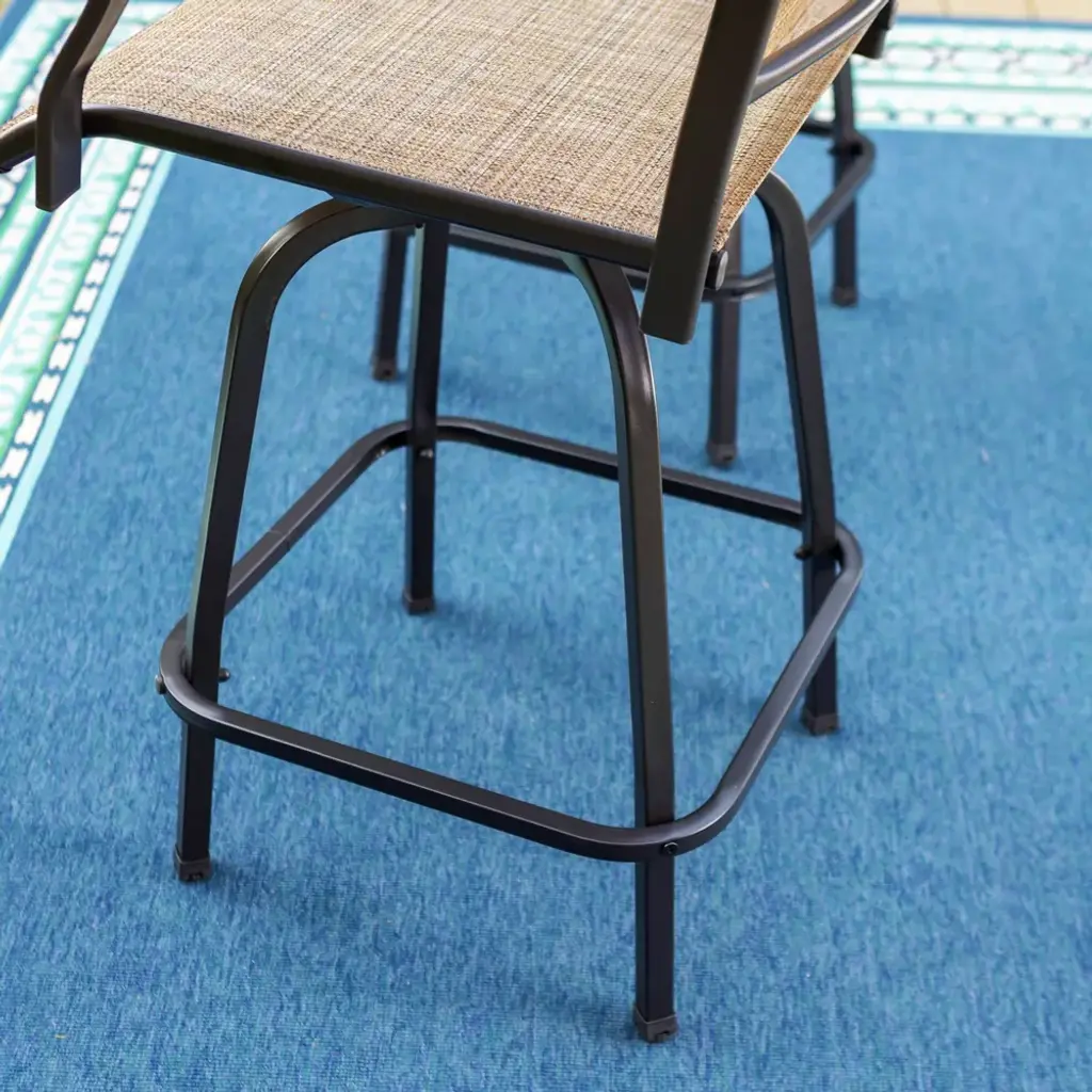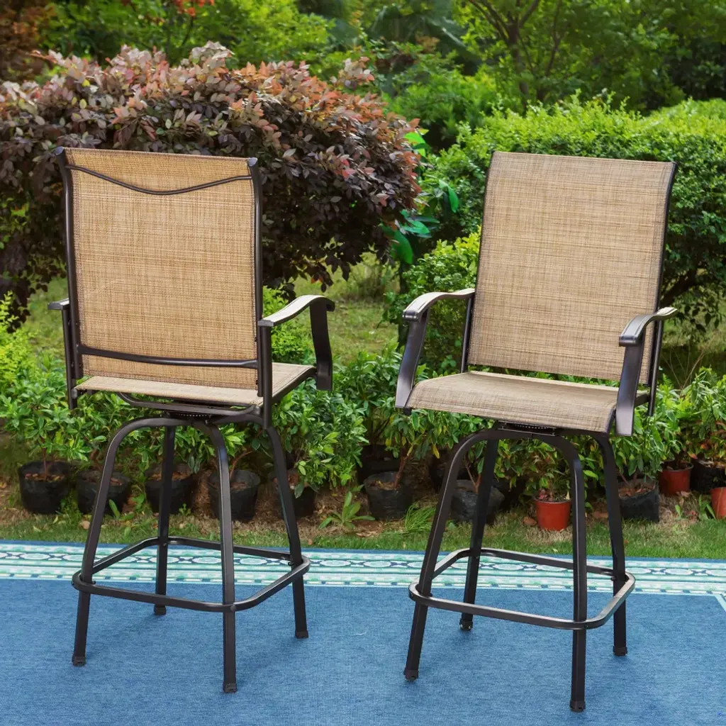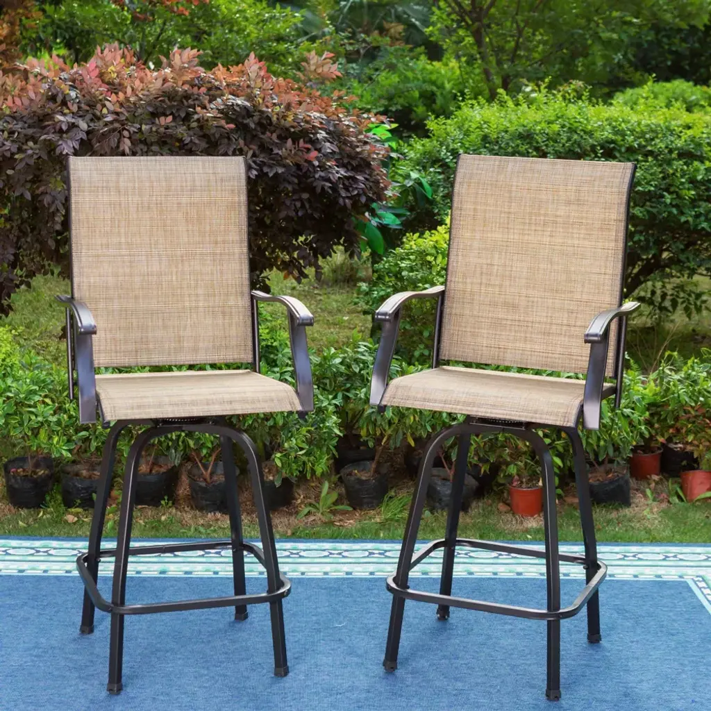 [CAPTIVA DESIGNS] Elevate your outdoor space with our 2pk Outdoor Swivel Bar Height Stools. Upgraded with adjustable knobs for easy assembly, these stools offer a 360-degree swivel function, curved arms, and breathable fabric for extended comfort. Built to last with a E-coating and Powder-coated metal frame, they hold up to 300 lbs. Perfect for indoor and outdoor settings, these stools set the mood for great conversations and cafe-style dining. Create a delightful atmosphere in your garden, porch, or yard with these bar stools, perfect for catching up with friends and family over coffee or wine.FEATURESSwivel Function: 360° swivel for added versatility and fun.Durable Steel Frame: Steel frame with Textilene fabric.Comfortable Design: Footrest and armrests.High Load Capacity: Supports up to 300lbs.Easy Assembly: Simple assembly, hardware included.Indoor and Outdoor Use: Versatile for any space.SPECIFICATIONDimensions (Overall): 23.3"W x 26.2"L x 51.8"HSeat Dimensions: 19.5"W x 19.3"D, Seat Height: 30.3"Floor to armrest: 38.3", Weight: 23.9 lbsPackage Includes2 x Bar Height Stools Instruction Manual (come with the box)Tips: Allow all the holes in the section to line up correctly and then tighten the screws. Assembly: 30 minutes to set up the bar stools.