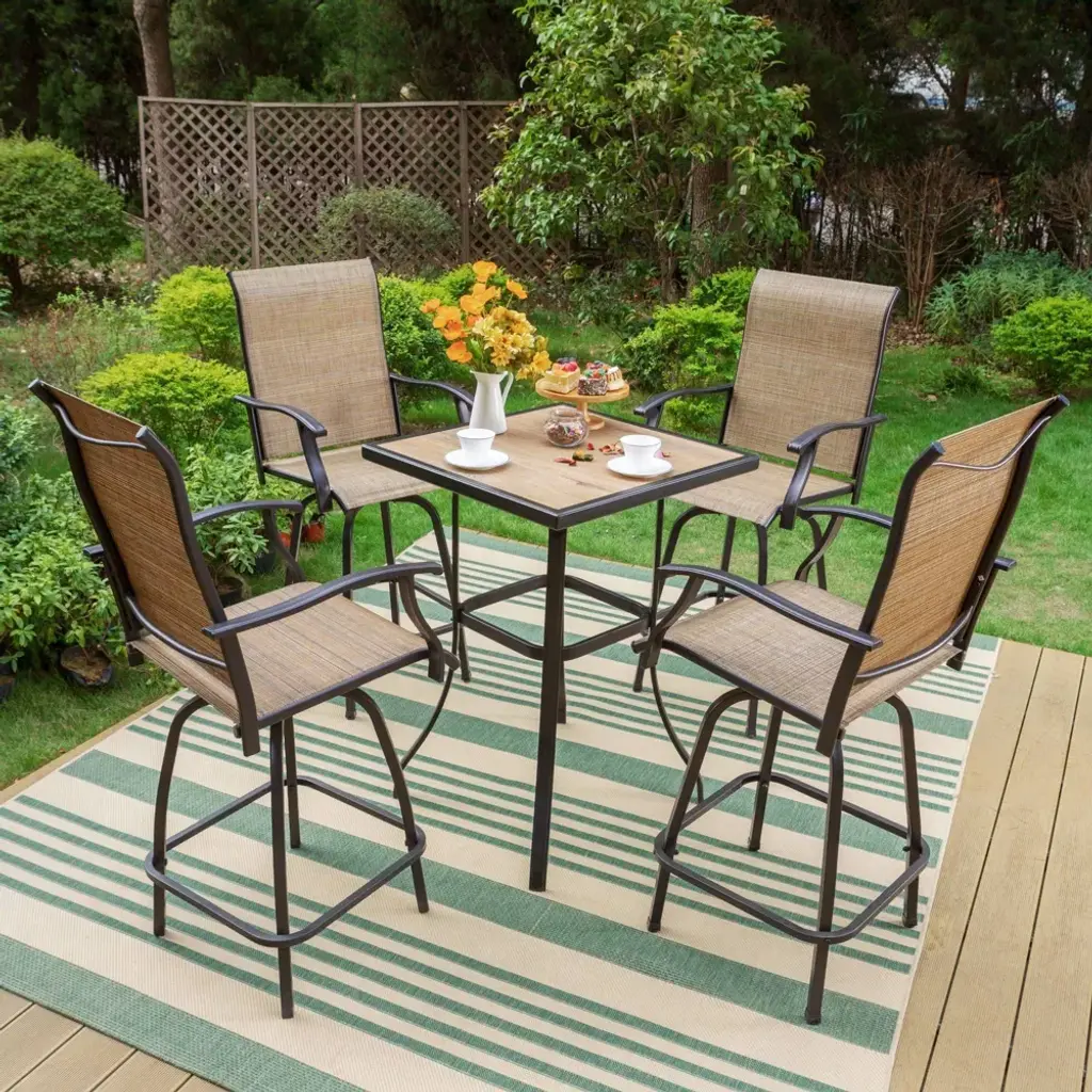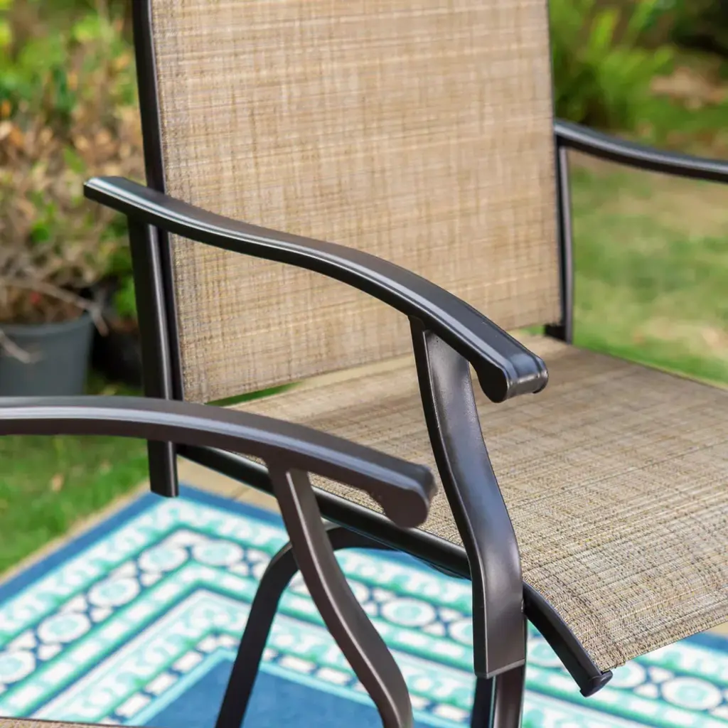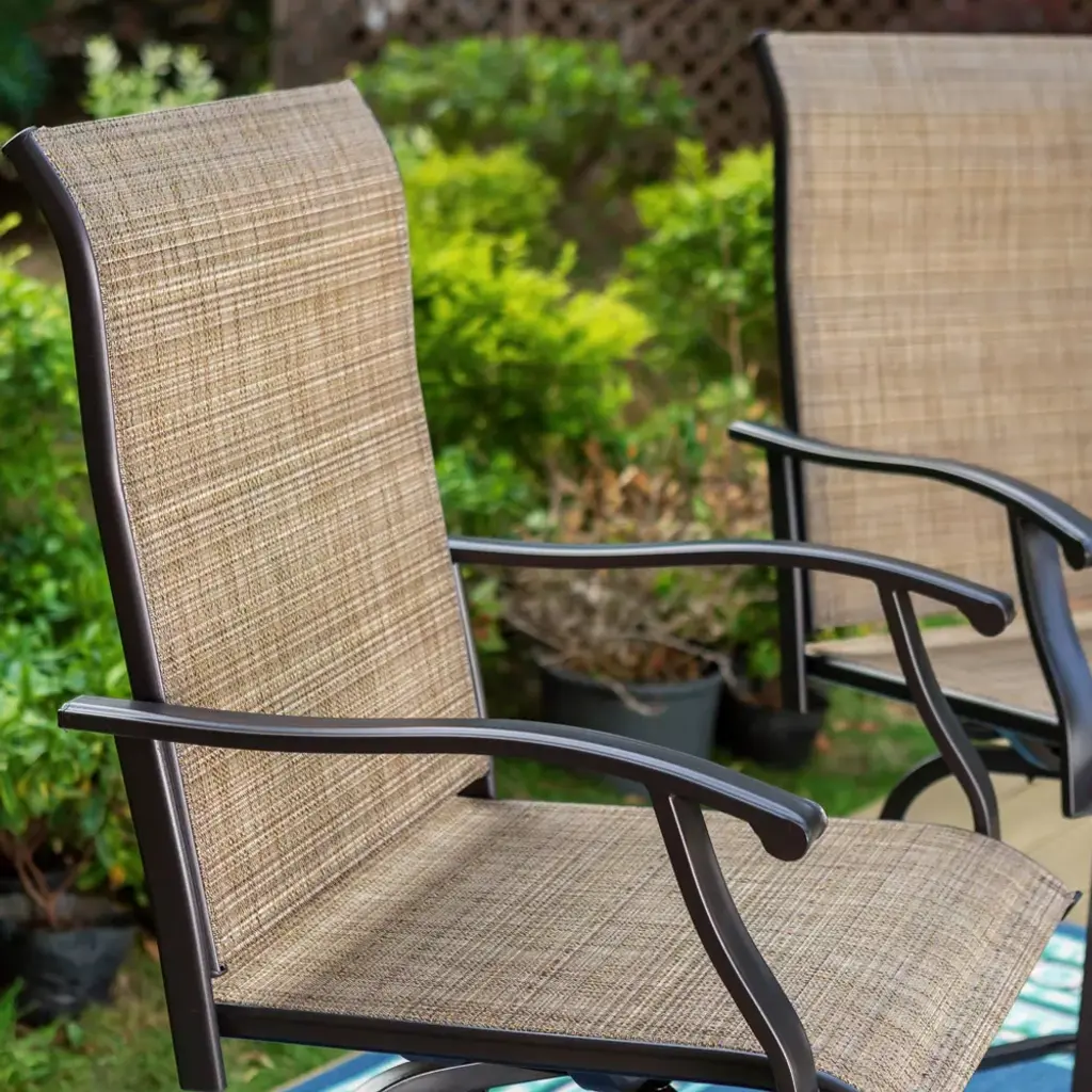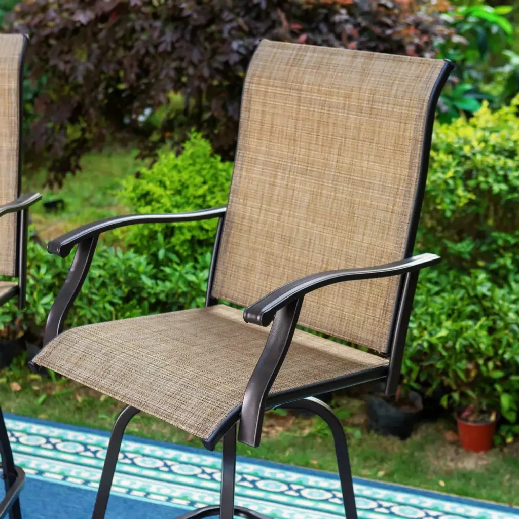 [CAPTIVA DESIGNS] Elevate your outdoor space with our 2pk Outdoor Swivel Bar Height Stools. Upgraded with adjustable knobs for easy assembly, these stools offer a 360-degree swivel function, curved arms, and breathable fabric for extended comfort. Built to last with a E-coating and Powder-coated metal frame, they hold up to 300 lbs. Perfect for indoor and outdoor settings, these stools set the mood for great conversations and cafe-style dining. Create a delightful atmosphere in your garden, porch, or yard with these bar stools, perfect for catching up with friends and family over coffee or wine.FEATURESSwivel Function: 360° swivel for added versatility and fun.Durable Steel Frame: Steel frame with Textilene fabric.Comfortable Design: Footrest and armrests.High Load Capacity: Supports up to 300lbs.Easy Assembly: Simple assembly, hardware included.Indoor and Outdoor Use: Versatile for any space.SPECIFICATIONDimensions (Overall): 23.3"W x 26.2"L x 51.8"HSeat Dimensions: 19.5"W x 19.3"D, Seat Height: 30.3"Floor to armrest: 38.3", Weight: 23.9 lbsPackage Includes2 x Bar Height Stools Instruction Manual (come with the box)Tips: Allow all the holes in the section to line up correctly and then tighten the screws. Assembly: 30 minutes to set up the bar stools.