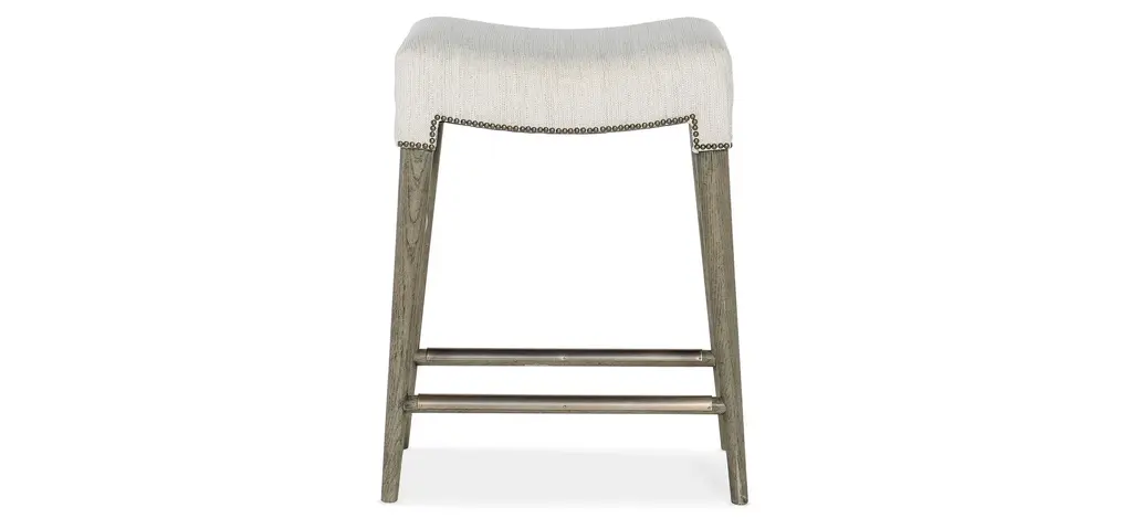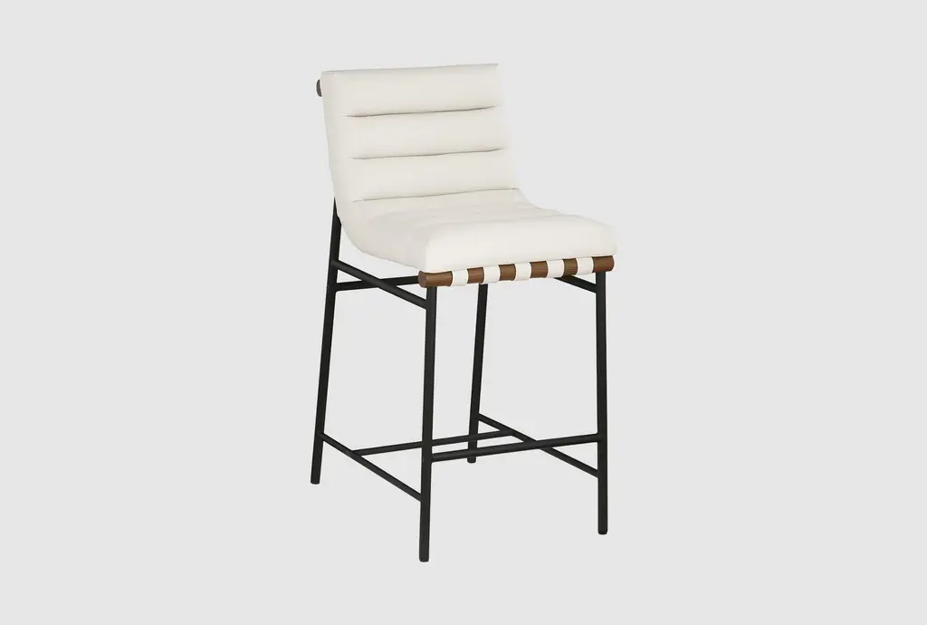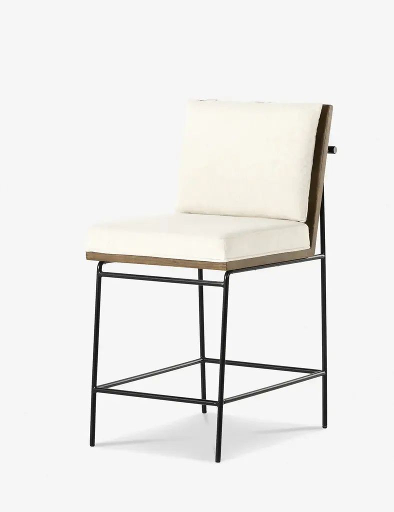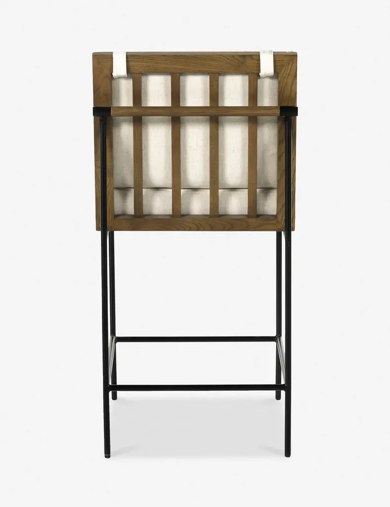 This bar and counter stool is all about crisp, clean style. Featuring a ladder-back and streamlined black iron frame, this bar chair design offers a sturdy yet welcoming look with an upholstered seat and back cushion.